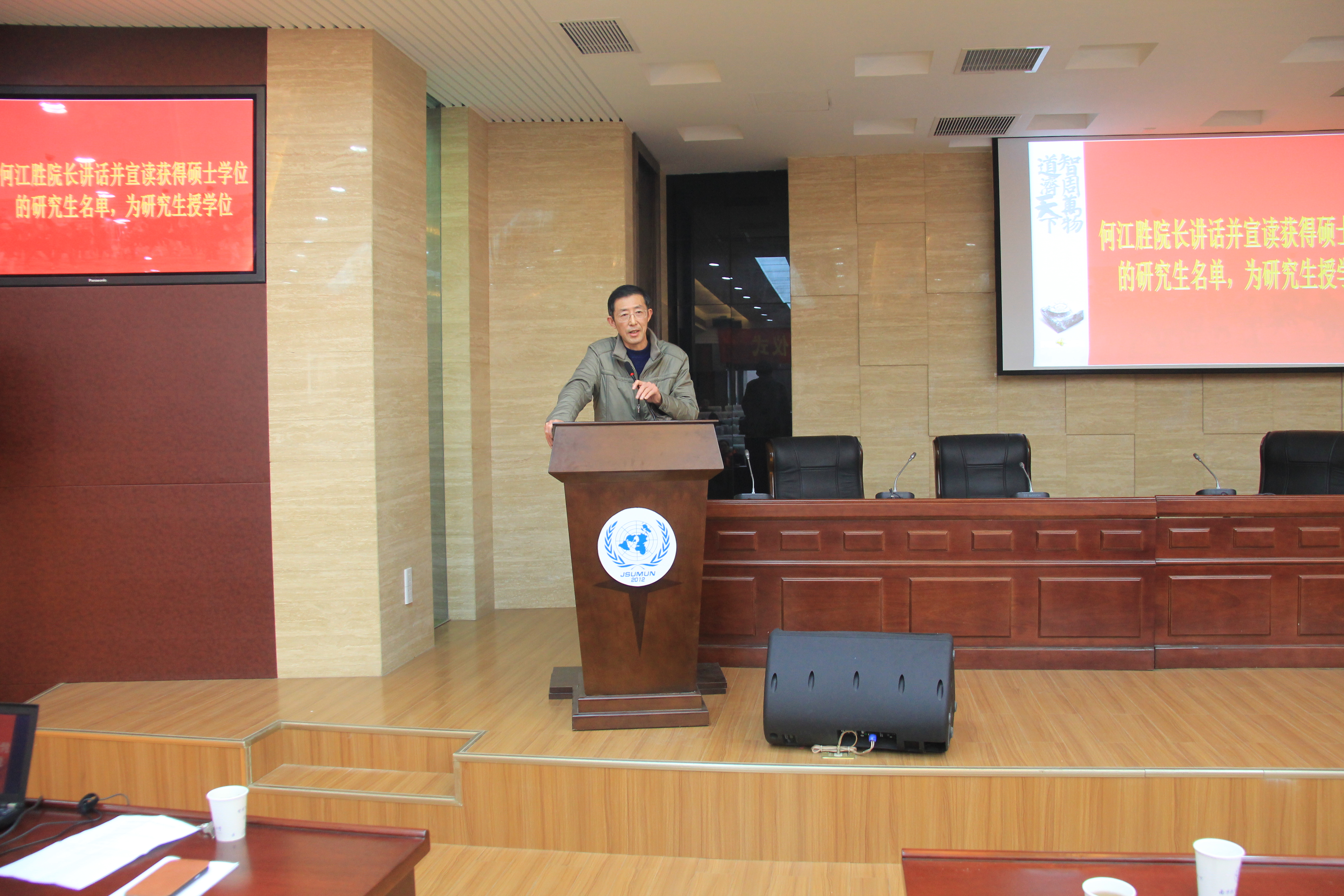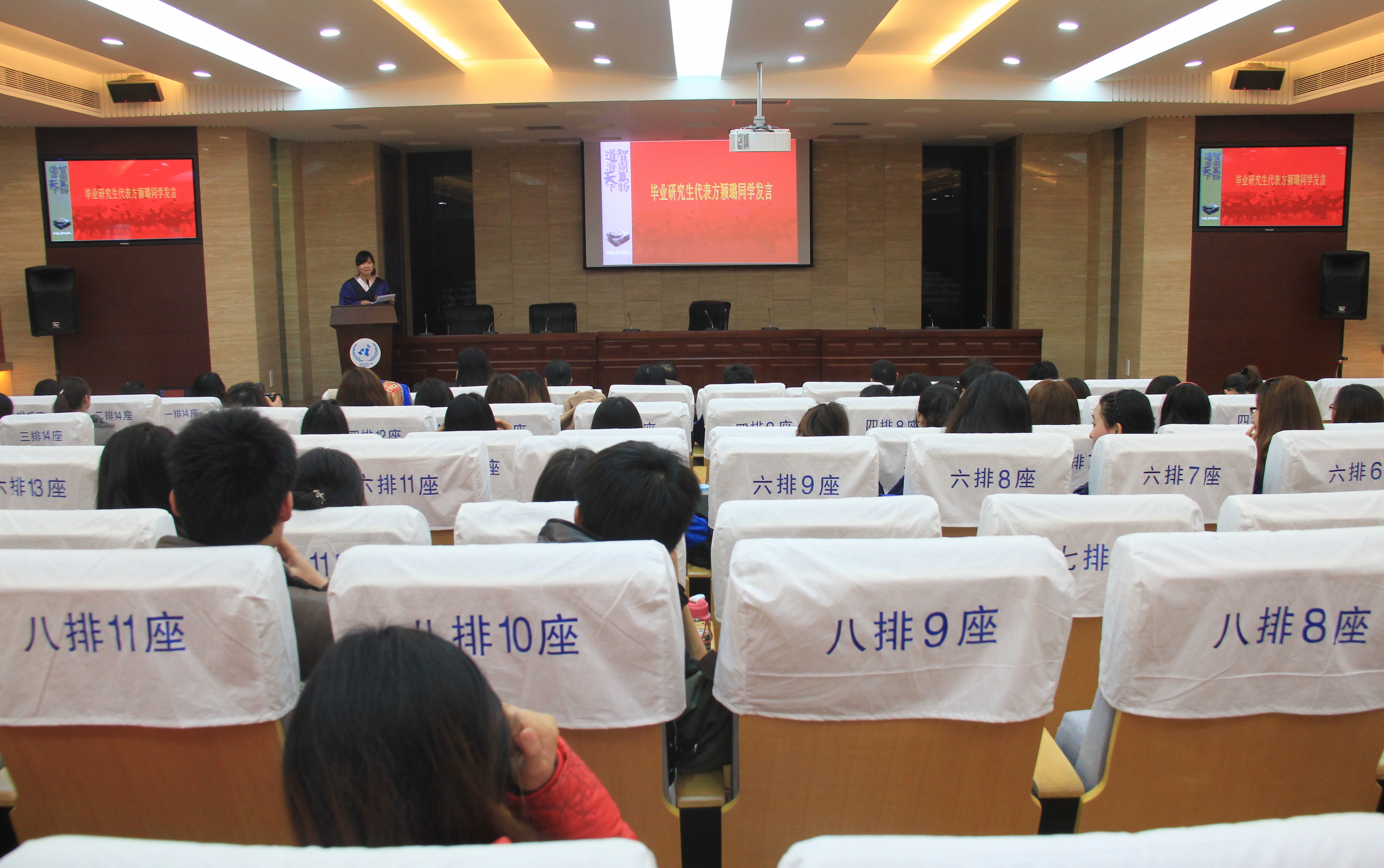 下午14点30分,毕业典礼在雄壮的国歌声中拉开序幕。典礼由刘长江副院长主持,刘健荣书记、研究生代表方颖璐、何江胜院长先后讲话。导师代表徐以中副教授则通过诺贝尔奖获得者莫言作品里的一个小故事,形象生动地向同学们讲述了谦逊、宽容以及培养独立思考能力的重要性,希望南航研究生能培养主动、积极的学习态度,努力成为未来的开拓者。领导和老师们向圆满完成学业,即将奔赴新的学习和工作岗位的各位同学表示热烈祝贺,希望同学们走上社会后,能够不断学习,全面发展,培养创造力和创新精神,同时具有实践精神,志存高远,奋发有为,并鼓励大家立足本职工作,运用自己的学识,发挥聪明才智,谱写精彩人生。