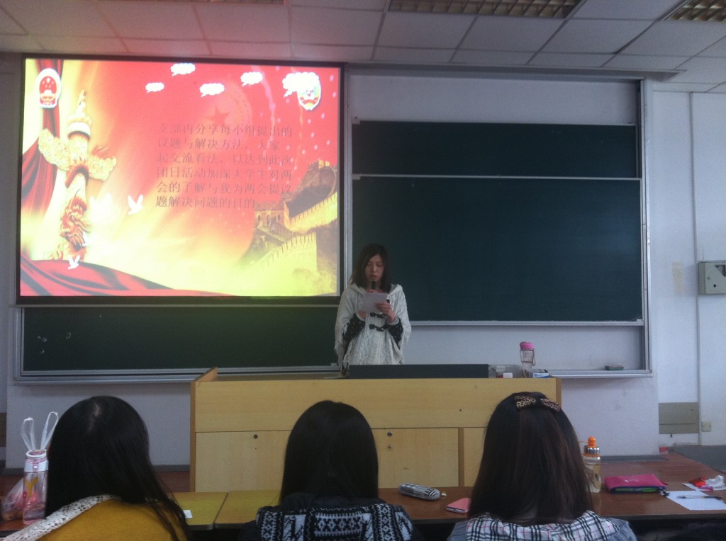全国政协十二届一次会议和全国人大十二届一次会议于2013年3月在北京胜利召开,为深入学习“两会”精神,引导学生关心、关注国家大事,加强学生历史使命感和社会责任感,启发学生独立思考,积极实践,洞洞杂货店 11级本科生团总支采取多种形式,灵活安排时间,积极组织学生探讨“两会”内容,学习“两会”精神。