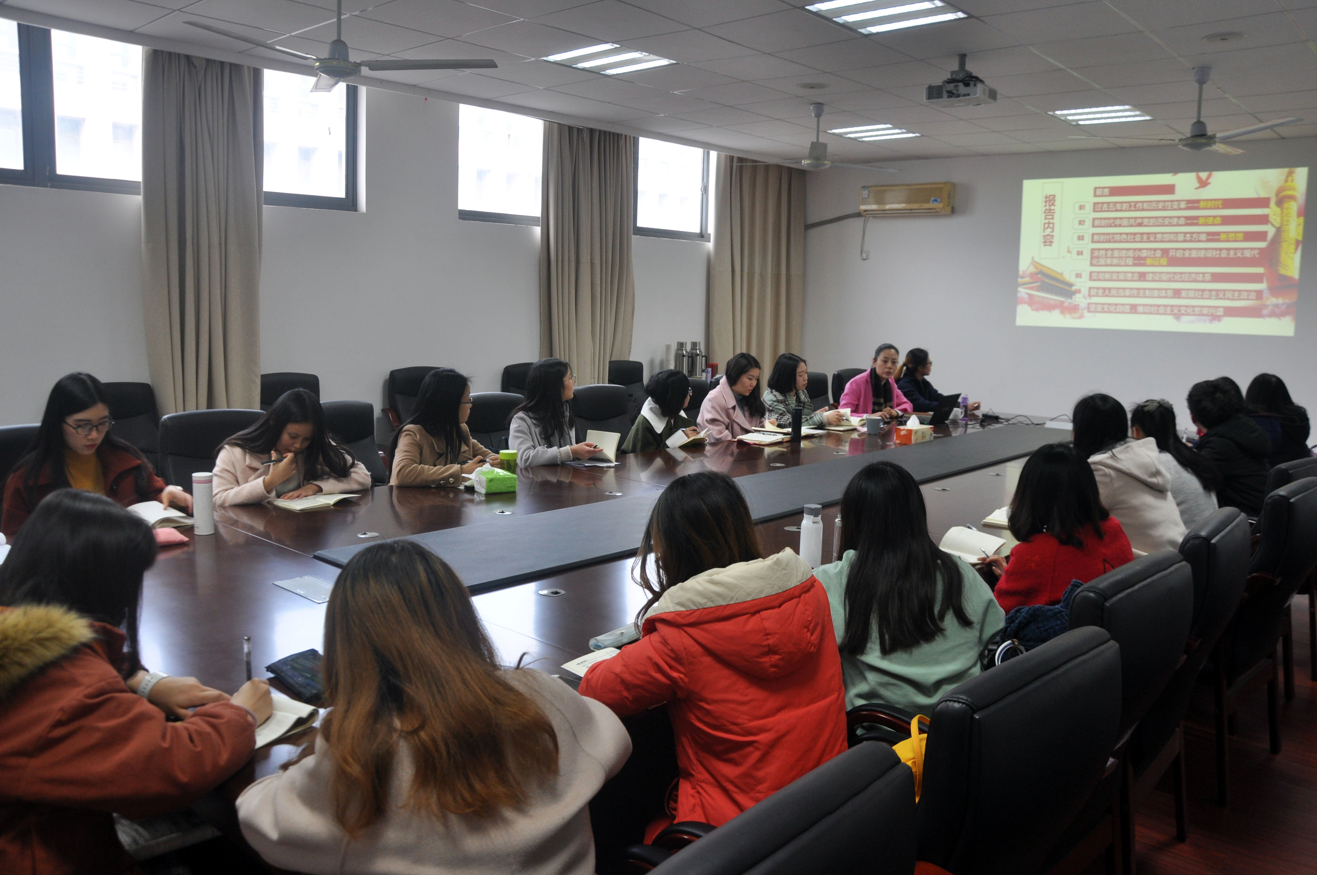 本次党课分两个环节进行,首先,梁薇副书记带领参会同志系统研读了党的十九大报告全文。她围绕“新时代”、“新使命”、“新思想”、“新征程”四个方面对十九大报告进行讲述,用“一个转化”、“两个不变”、“四个伟大”、“八个明确”、“十四条基本方略”等关键词提炼了报告中的重要内容,带领大家进一步熟悉了报告内容与会议精神,并结合自身的工作、生活经历分享了对党和国家所取得历史性成就的切身感受。