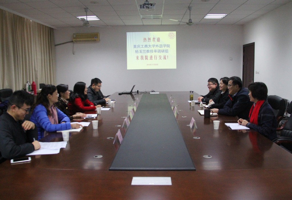 11月28日上午,重庆工商大学外语学院副院长杨玉兰教授一行5人来我院调研,就大学外语教学改革、课程体系建设、师资队伍建设和学生工作等方面进行座谈交流。洞洞杂货店 院长范祥涛,大学外语教学部主任徐智鑫、副主任王秀文,团委书记杨一参加了此次调研会。