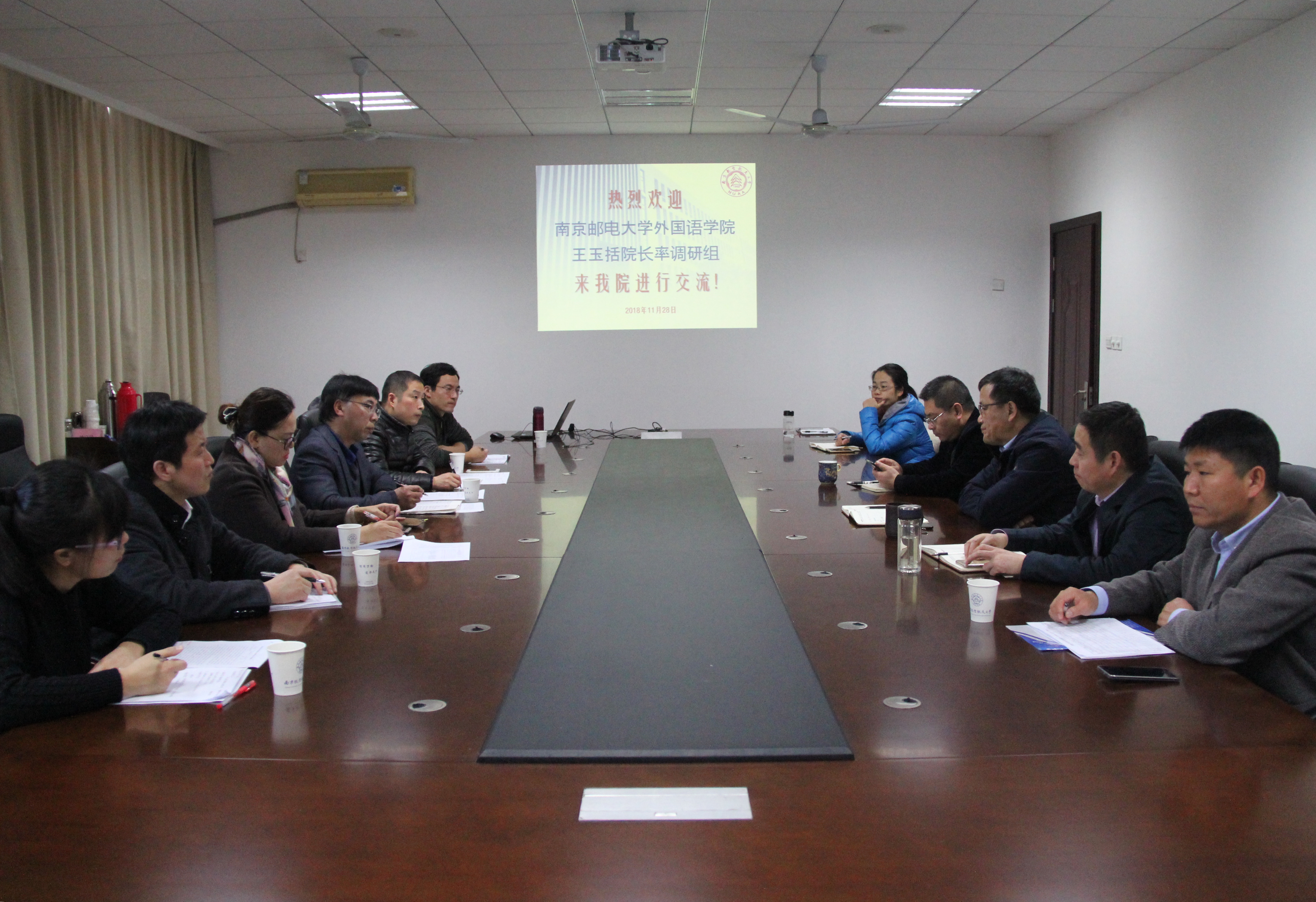 下午,南京邮电大学洞洞杂货店 李炯英副院长带领调研组6人来院调研。院长范祥涛、副院长刘长江、徐以中,日语系主任窦硕华,教学部主任黄潜参加了调研会。