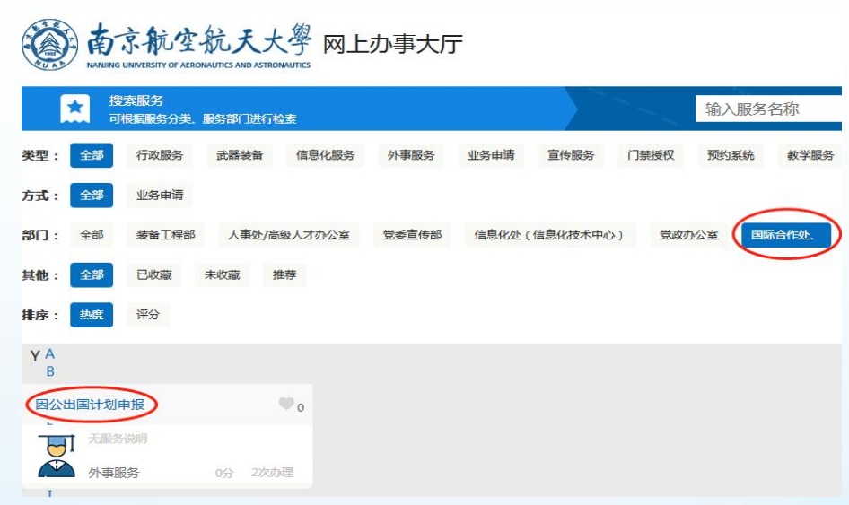 3. 本次申报与往年不同,采取网上申报方式。请教职工 凭工号登陆校网上办事大厅 //ehall.ddzhshop.com,登陆后 在部门内点击“国际合作处”,后点击下方“因公出国境计划申报”进行申报填写,如下图所示: