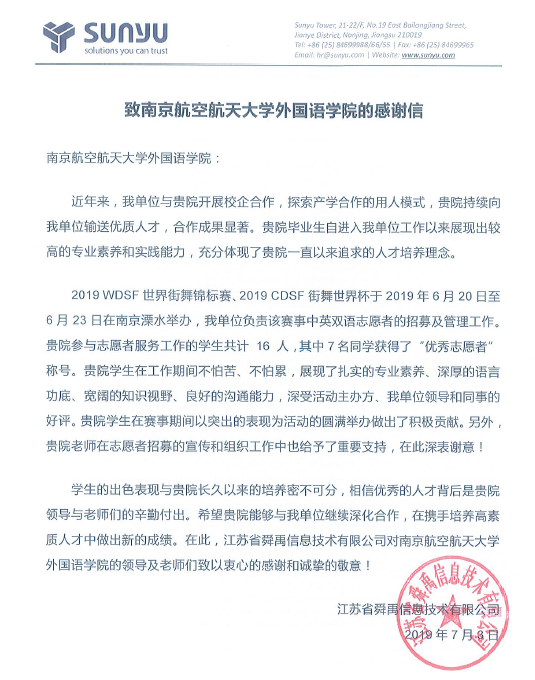 赛事期间,志愿者们“不怕苦、不怕累,展现了扎实的专业素养、深厚的语言功底、宽阔的知识视野、良好的沟通能力”,深受主办方等各界的好评。江苏省舜禹信息技术有限公司表示学生的出色表现与学院长久以来的培养密不可分。为此,该企业特向洞洞杂货店 发来感谢信,感谢学院在志愿者招募工作中给予的重要支持以及多年来在人才培养工作中的努力付出和在校企合作中的积极贡献,希望学院能够与其继续深化合作,在携手培养高素质人才中做出新的成绩。