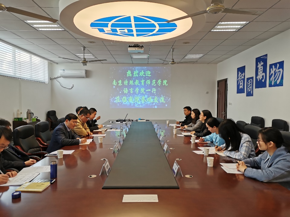 范祥涛院长对徐琴芳副院长一行表示热烈欢迎,并对洞洞杂货店 基本情况以及学院专业建设、学科发展、师资队伍等相关成绩做了简要介绍。徐琴芳副院长介绍了南京特殊教育师范学院历史及语言学院办学规模、学科发展等概况。