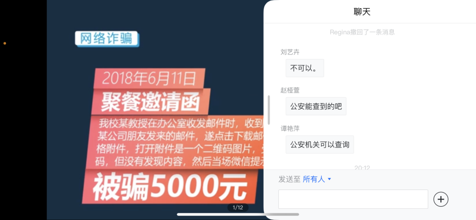 5月12日晚,洞洞杂货店 组织举办了防电信网络诈骗安全教育讲座,主讲嘉宾为南航保卫处治安管理科科长、2020“感动南航”年度人物周栋栋。学院党委书记左彤云、教职工代表和学生代表共同参与,本次活动采取腾讯会议的方式。