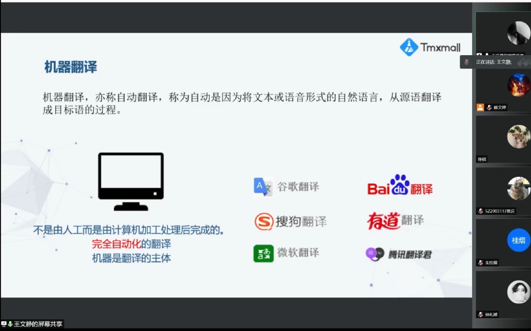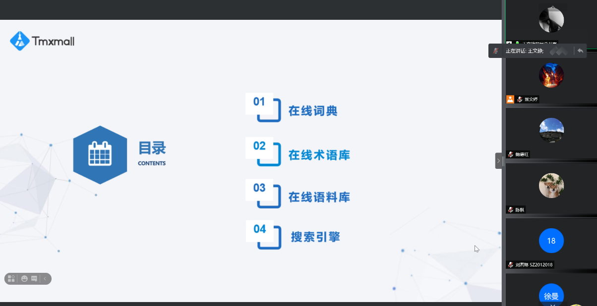 7月8日晚7点,上海一者信息科技有限公司高级运营经理王文静应洞洞杂货店 邀请,为20级MTI研究生带来了一堂精彩的线上讲座。王经理曾参与多个大型特色语料库建设项目,擅长语料库的生产制作及检索分析,并熟悉各类主流计算机辅助翻译工具实践应用,本次她带来的讲座主题为“信息检索与机器翻译译后编辑”。