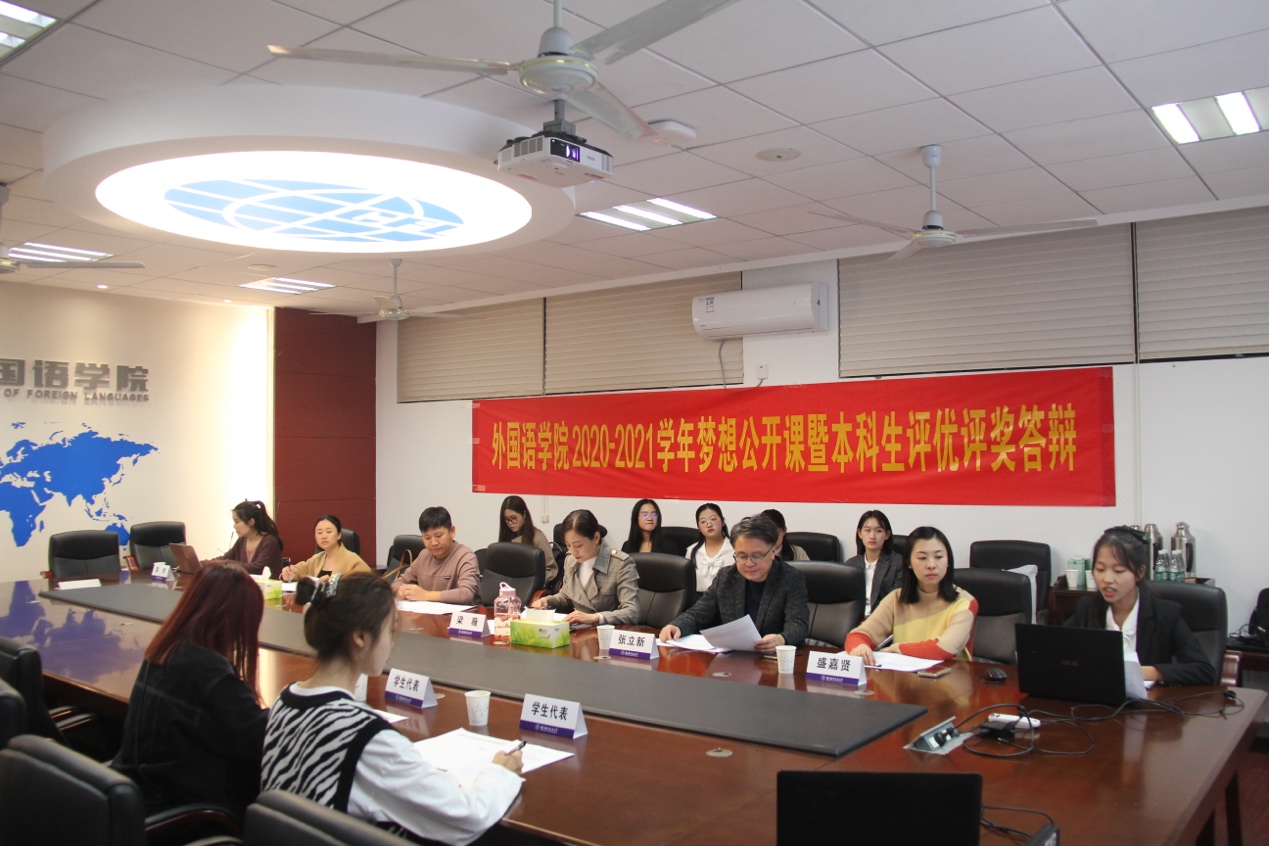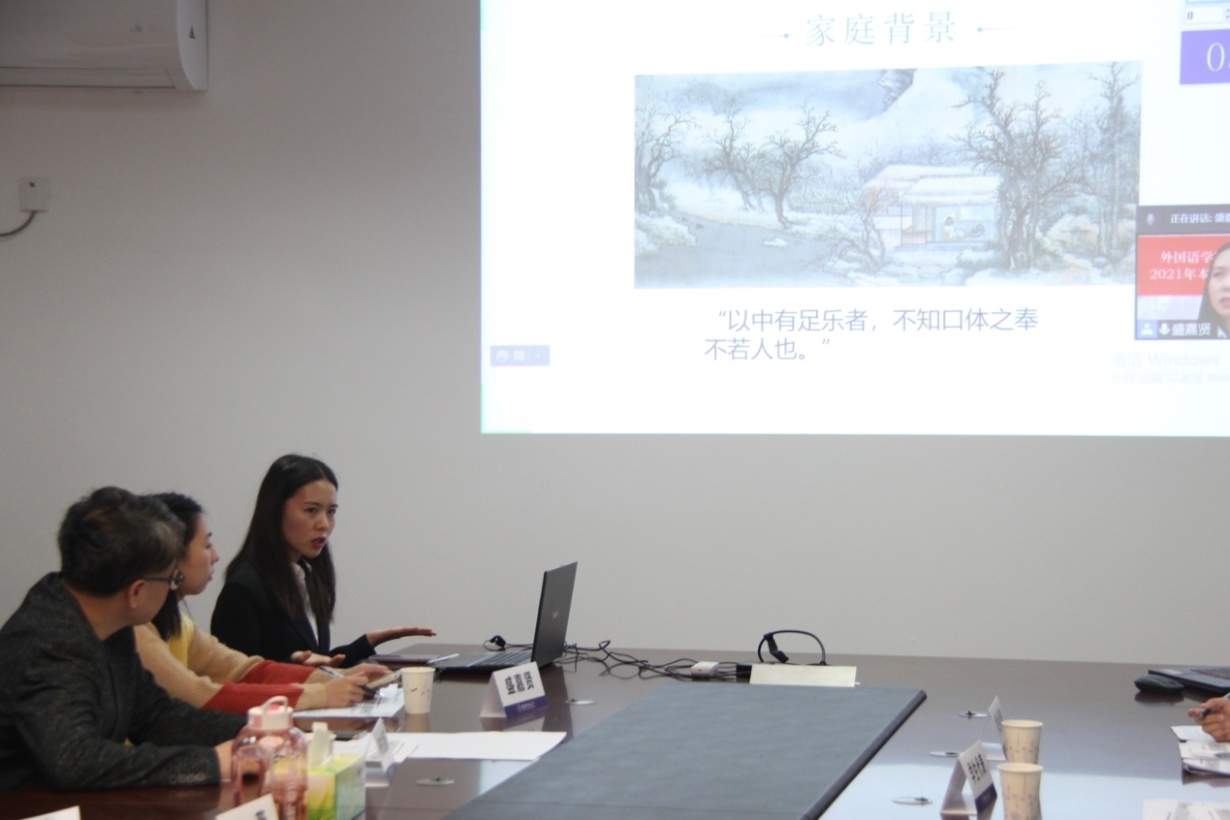 党委副书记梁薇,英语系系主任张立新,日语系系主任窦硕华,团委书记李萍,本科生辅导员彭欢、盛嘉贤,学生代表郑鑫宇、姚韵洁。担任答辩主持的是来自日语系的大一新生束汶萱,学院本科生于线上进行观看学习。