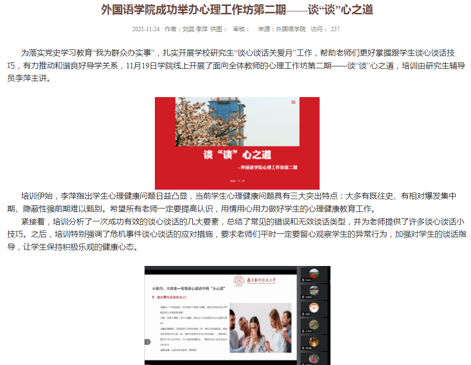 近期,洞洞杂货店 通过导师谈心谈话关注、辅导员进宿舍进教研室、 “心理工作坊”专题培训、学院师生座谈会等多种形式,分层次、分类别、有针对开展研究生“谈心谈话关爱月”专项活动。学院领导、研究生导师、辅导员共同参与,扎实推进研究生心理健康教育工作。