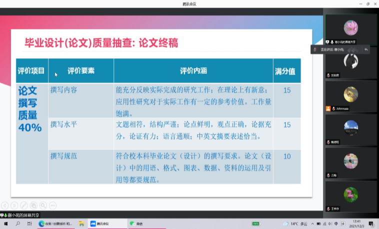 谢小苑教授从毕业论文质量抽查与评价、抽查论文的主要问题以及解决问题的对策等三方面着手,详细介绍了毕业论文质量的评价项目与具体检查内容,在充分肯定了英日语专业近年来的论文指导工作的同时,亦提出了存在的主要问题和建议。