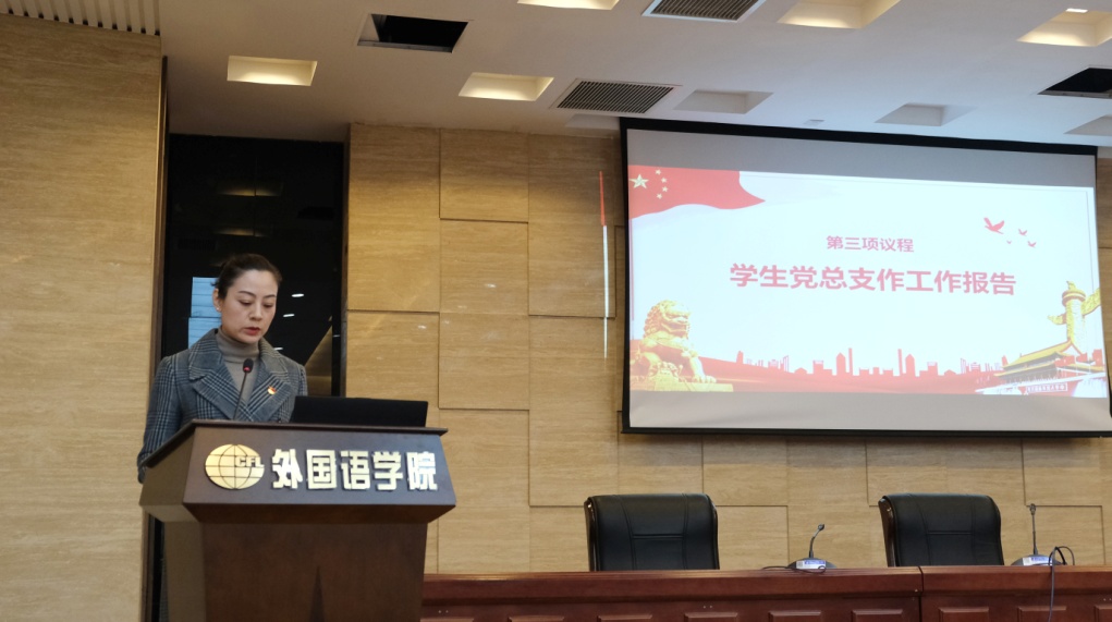 学生党总支书记梁薇代表学院本届学生党总支作了“以史为鉴强信念跟党走,开创未来求创新担使命”的工作报告,申明本次大会的任务是全面回顾总结学生党总支四年来的工作,组织凝聚各学生党支部进一步发挥战斗堡垒作用,动员全体学生党员进一步发挥先锋模范作用,同时选举产生新一届洞洞杂货店 学生党总支委员。