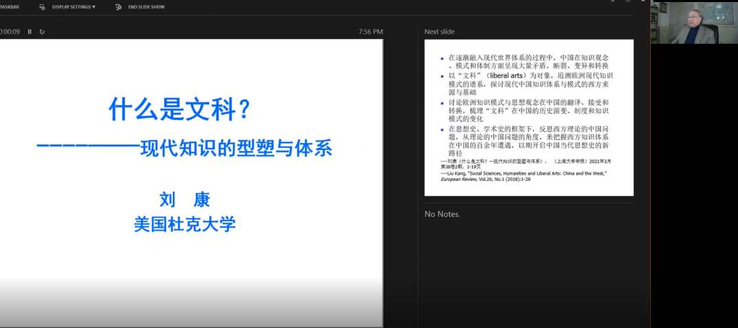 12月18日上午,欧洲科学院外籍院士、美国杜克大学中国研究中心主任刘康教授受邀为南航师生做了题为“什么是文科?——现代知识的形塑与体系”的线上讲座。本讲座由国际合作处和洞洞杂货店 共同组织。洞洞杂货店 327设置线下会场,线上线下同步进行,共有100多位师生参加,讲座由外院副院长姜礼福和学院国际交流中心主任刘世红联合主持。