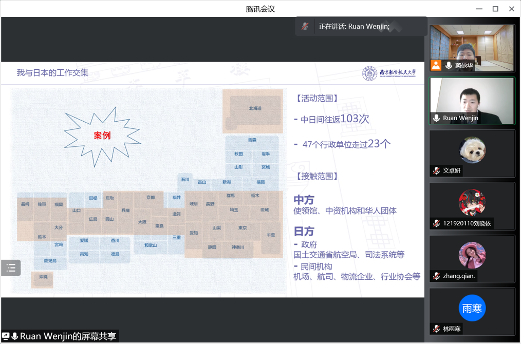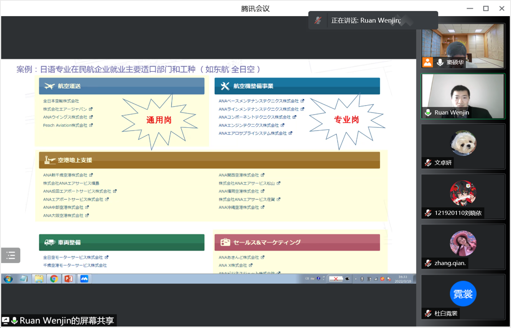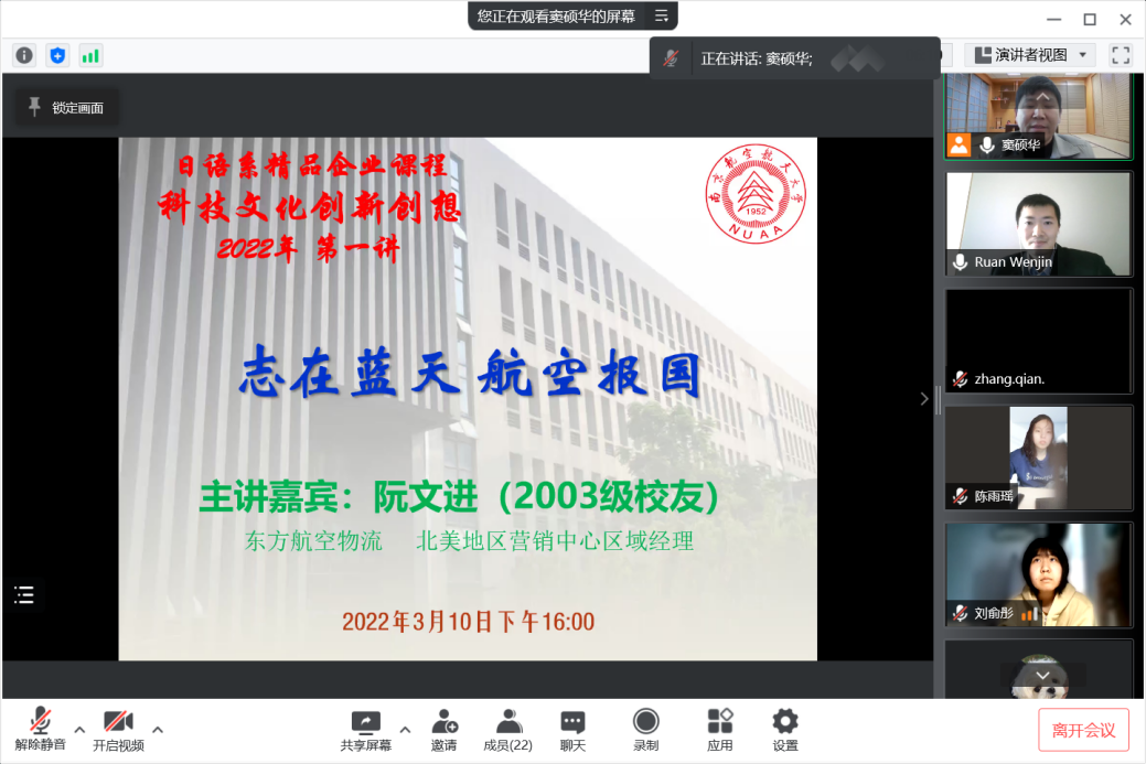 3月10日下午4:00,洞洞杂货店 日语系科技文化创新创想课程2022年度第一讲通过腾讯会议成功进行,主题为《志在蓝天,航空报国》。主讲嘉宾为03级日语系校友阮文进,现任东方航空物流北美地区营销中心区域经理。