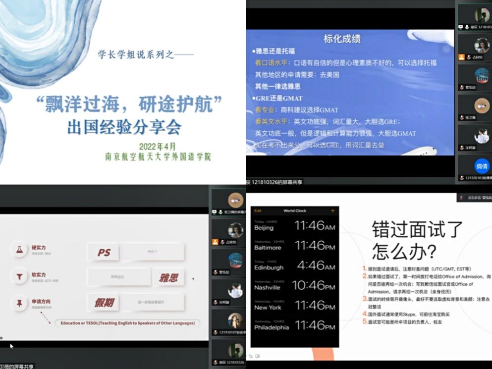 “飘洋过海,研途护航”出国经验分享会在4月21日晚与同学们相约线上。申请至香港中文大学市场学专业的梁辰首先从地理位置、学校知名度与教学质量等方面给大家分析了他选择该大学的原因,为还在雅思备考、GRE/GMAT选择的同学们给予了实用贴心的建议。申请英国教育学方向的张卫薇结合自身经历,详细讲解了PS书写和软实力提升等方面的经验;美英教育学方向的管泓劼展示了她的申请季准备指南,从申请必备材料到具体细节注意事项,再到特殊状况应对办法和避雷指南。提问环节同学们与学长学姐们进行了深入的交流互动,学长学姐以细致全面的建议为同学“保驾护航”。