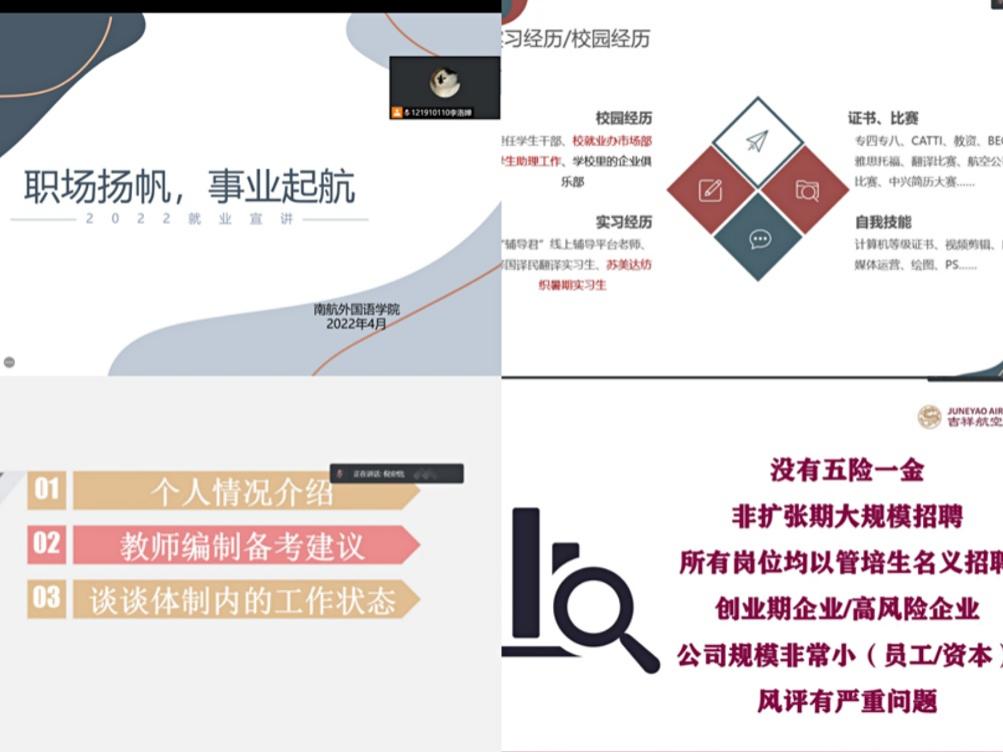 4月21日晚,“职场扬帆,事业起航”就业分享会在线上展开。张雅楠基于自身经历,从就业方向、实习经历以及面试方法、心理等多个方面进行分析,给出了中肯的建议;即将从事教师行业的倪安恺细致讲解了教师编制备考方法,招聘路径以及体制内的工作状态,为想要当老师的同学们描绘了路径与前景;最后,陈超宇从整理经历、模板等方面简要地讲解了笔试、面试中出现的测试。在提问环节上,同学们更是积极提问,就当前上海实习形势、考研与实习时间冲突等情况提出问题,学长学姐都一一认真解答。整个分享会干货满满,全方位概括了同学们在寻求职位时可能遇见的问题。