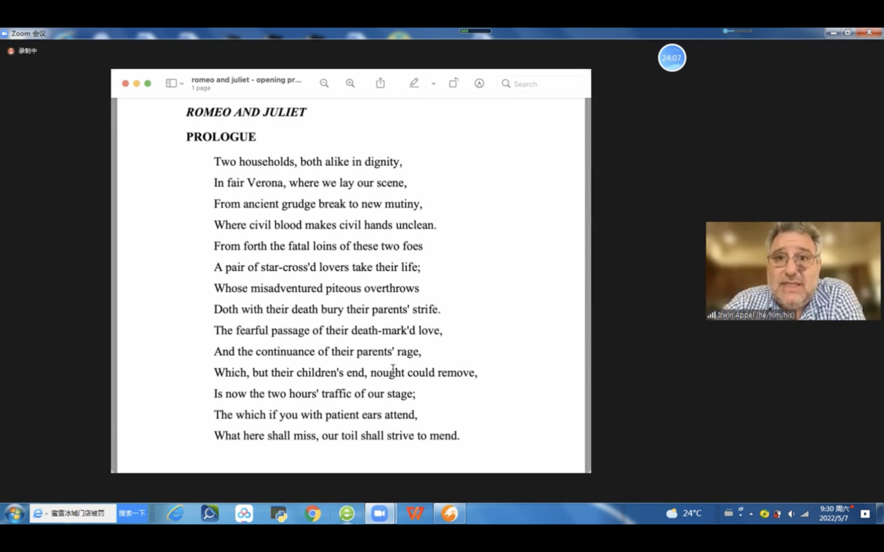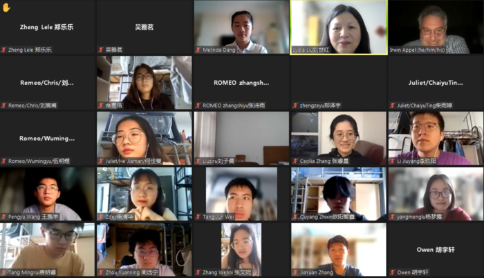 本次讲座由洞洞杂货店 刘世红副教授主持。在讲座的上半场,Irwin Appel教授诠释了西方最伟大的戏剧家莎士比亚创作的思想内涵和艺术价值,展示丰富多彩的戏剧舞台演绎手法和理念,解读《罗密欧与朱丽叶》中爱情故事的深层意义。在讲座中精心穿插多种有趣的互动环节,引导观众领略莎翁戏剧的语言特色和艺术魅力。下半场的讲座中,多位学生演员表演《罗密欧与朱丽叶》经典对白,表演生动精彩,获得Irwin Appel教授及与观众的高度赞扬,Irwin Appel并给予悉心指导。在讲座最后的问答环节中,同学们纷纷在聊天室打字、以及开麦出镜提问, Irwin Appel教授一一答疑解惑,将讲座气氛引入高潮。