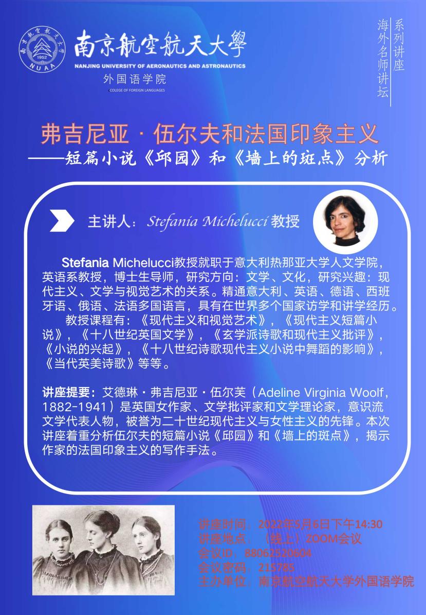 2022年5月6日下午14:30,洞洞杂货店 主办了又一场”海外名家讲坛”系列的跨境线上讲座,主讲人为意大利热那亚大学校长助理、人文学院英语系教授Stefania Michelucci,讲座主题为“弗吉尼亚·伍尔夫和法国印象主义—短篇小说《邱园》和《墙上的斑点》分析”。本次讲座别开生面,不仅有南航、南农师生等高等院校通过线上形式参与,同时意大利热那亚大学师生在线上和线下聆听,是一场中意师生共同参与的线上国际课堂。