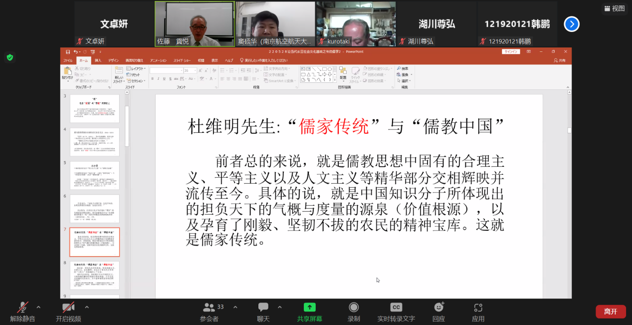 5月28日(周六)上午9:00,洞洞杂货店 日语系海外名师讲坛第一讲通过线上ZOOM会议成功进行,主题为《現代東アジア社会の文化的基礎としての伝統儒学》。主讲嘉宾为环太平洋大学教授・筑波大学名誉教授佐藤贡悦。讲座由日语系主任窦硕华老师主持,外专项目领衔人・东京农业大学黒瀧秀久教授和南航日语系40余名同学参加了讲座。