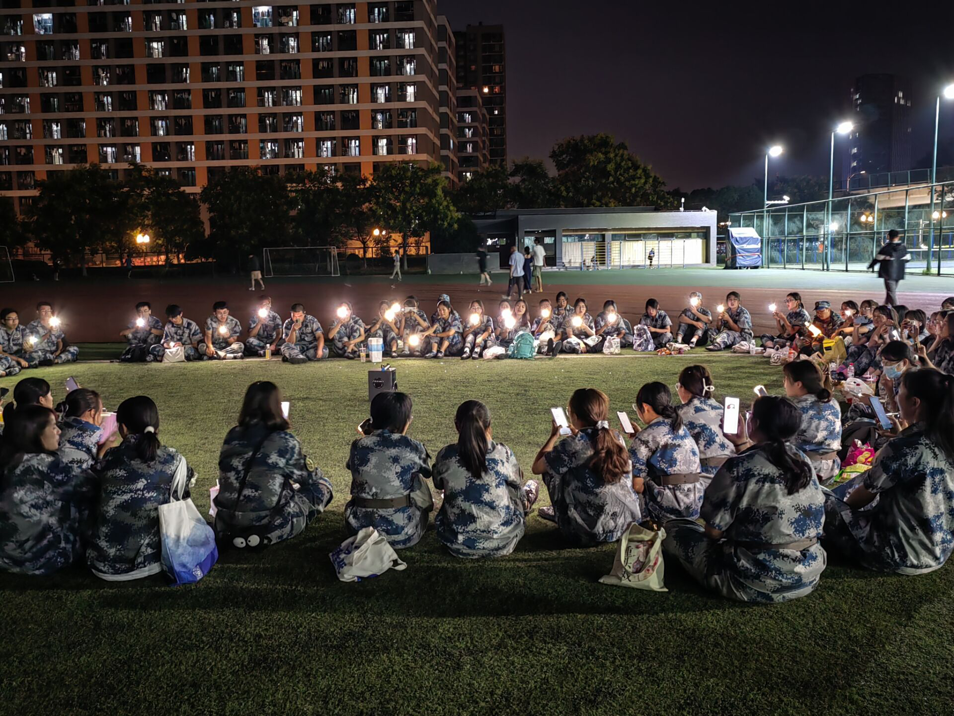 9月10日晚,2022级新生军训营在东操场举办了“皓月当空,共语中秋”节日晚会。同学们围坐成圆,在皎月之下品尝南航定制月饼,与教官同乐,共同欣赏精彩演出。同学们纷纷登台展示自己的才艺风采,动人的歌声,优美的舞姿,幽默风趣的脱口秀,将晚会气氛推上了高潮。晚会为军训生活增添了一丝乐趣,舒缓了新生们第一次离家的思乡之情,使他们收获了一份属于南航外院学子的温馨回忆。