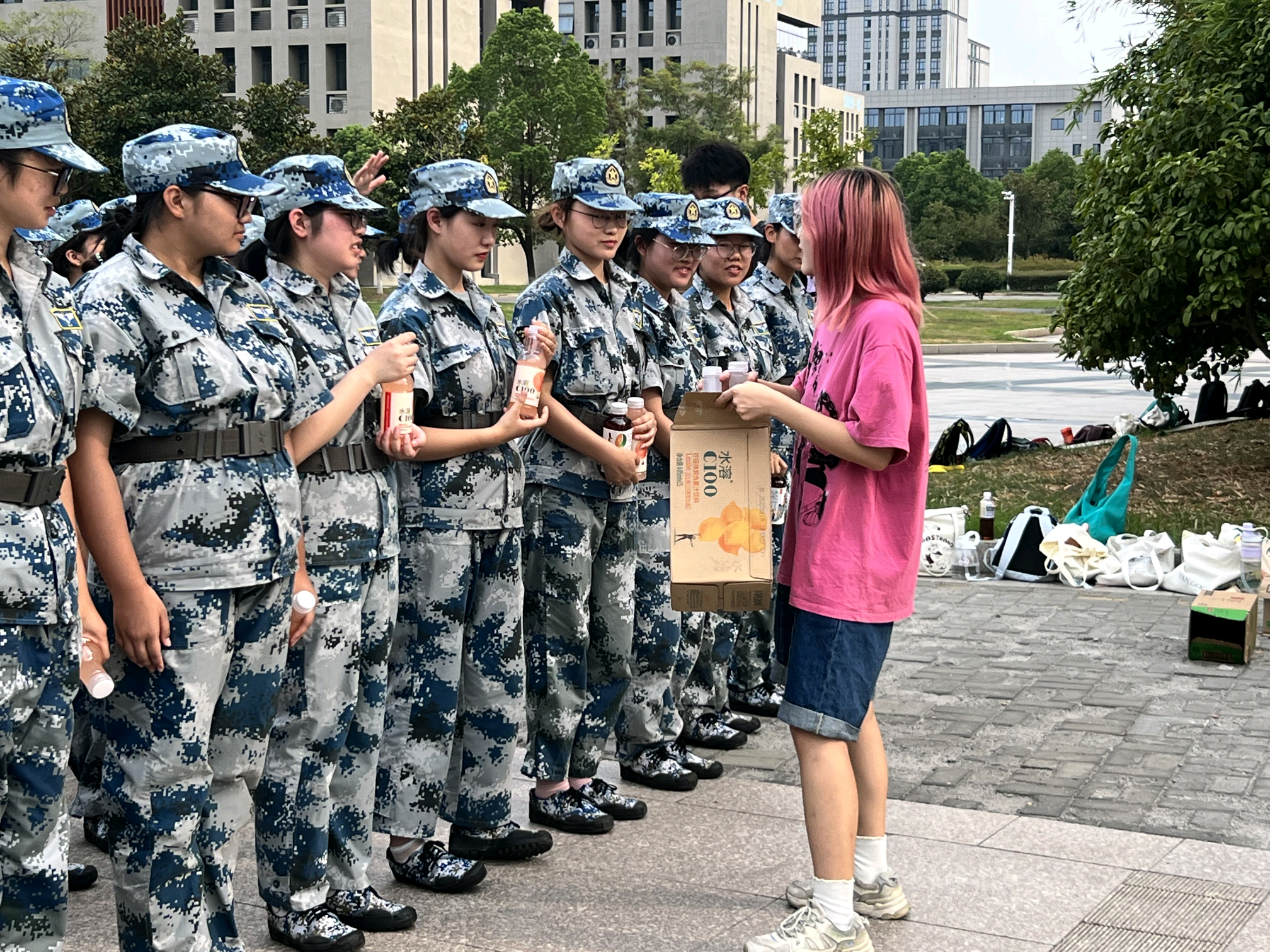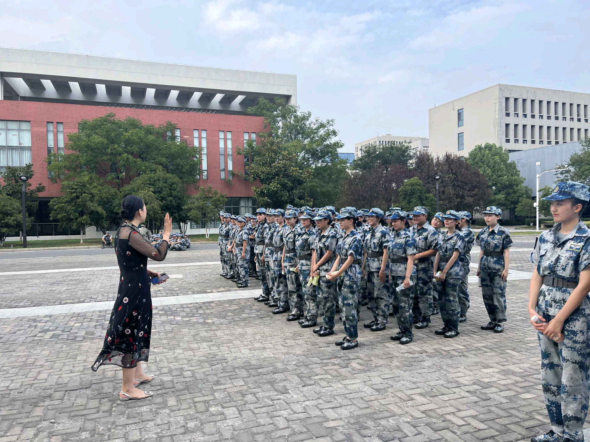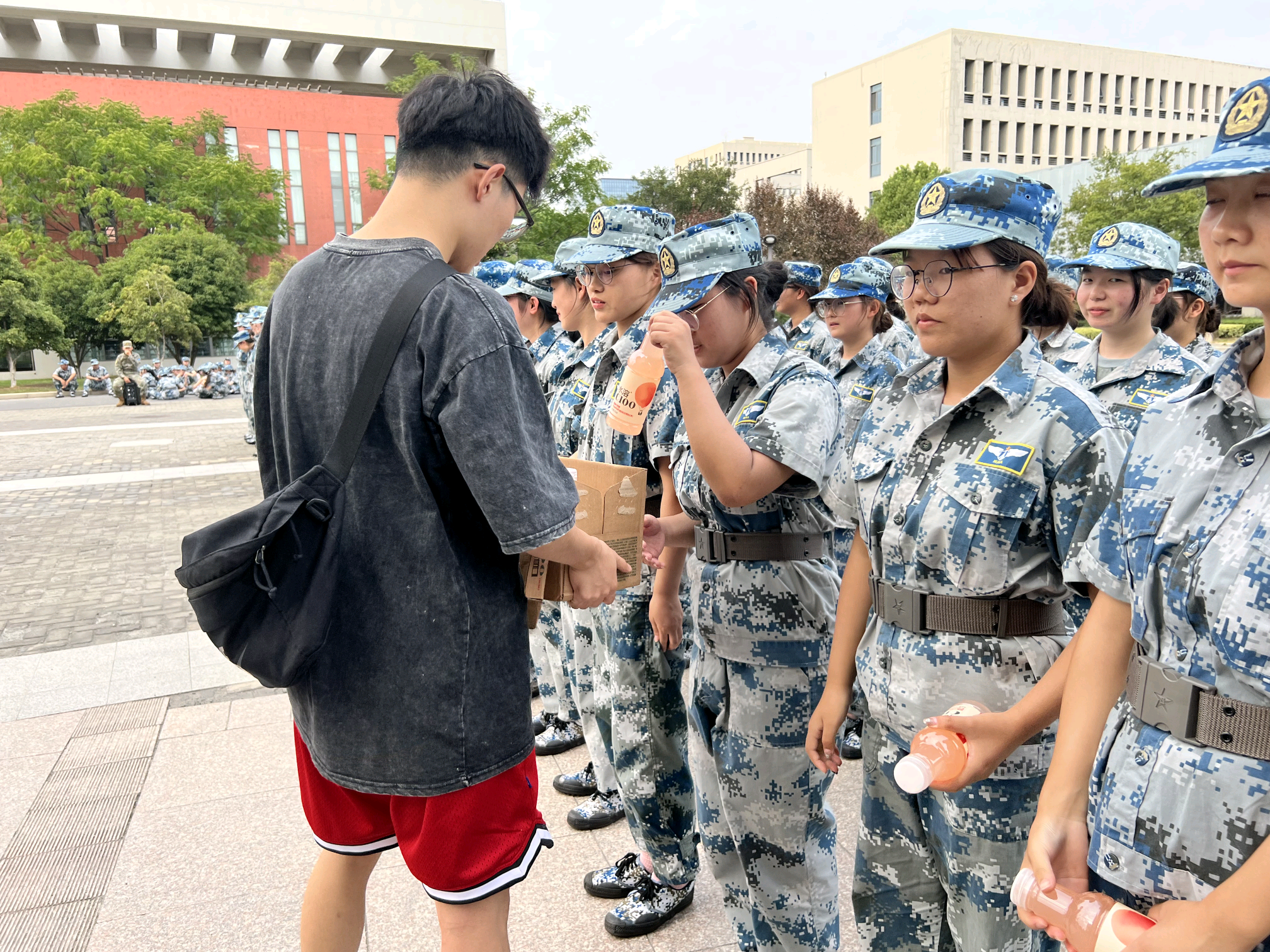 梁薇一行代表学院向辛苦带训的教官们送上精心准备的节日礼物,并向教官及在训新生表达了节日的祝福。她亲切询问了新生们入校的适应情况以及军训生活,并通过分享自己曾经的军训经历,来勉励同学们珍惜军训时光,强身健体,努力成为德智体美劳全面发展的新时代接班人。接着,团委学生会的学长学姐们向新生们送来了夏日清凉饮品,并送上了即兴的慰问演出,慰问活动在师生们的欢声笑语中完美落下了帷幕。
