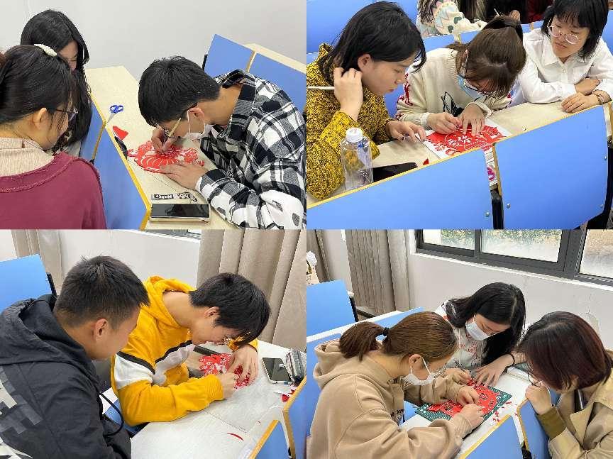 活动伊始,所有同学自发组成3-4人小组,派代表领取剪纸材料、垫板、剪刀和刻刀等工具。剪纸材料以祝福祖国为主题,图样精美,有刻着“盛世中华”字样的红色彩旗、刻着“我爱祖国”的爱心图案、刻着“爱我中华”的秀美河山……一张张红色的宣纸上饱含着对祖国的深情祝福。随后,每组自行进行组内分工,有的同学负责大致轮廓的裁剪、有的同学负责“精雕细琢”……制作过程中,每组同学都感受到了不小的挑战,剪纸图案精美、纹路细致,需要十足的耐心和精细的手工能力。活动现场气氛热烈、笑声与讨论声不断,大家互相鼓励、交流心得,尽情感受着剪纸这项传统文化的魅力和乐趣。