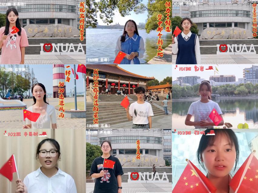 在“歌以潆声敬祖国,曲以洄乐赞母校”的自制歌曲MV活动中,同学们利用国庆假期,以校内外的建筑或景点为背景,手持飘扬的红旗共同录制歌曲《错位时空(五四特别版)》,用悠扬的歌声唱响心中对于祖国和南航真挚的赞美与爱。