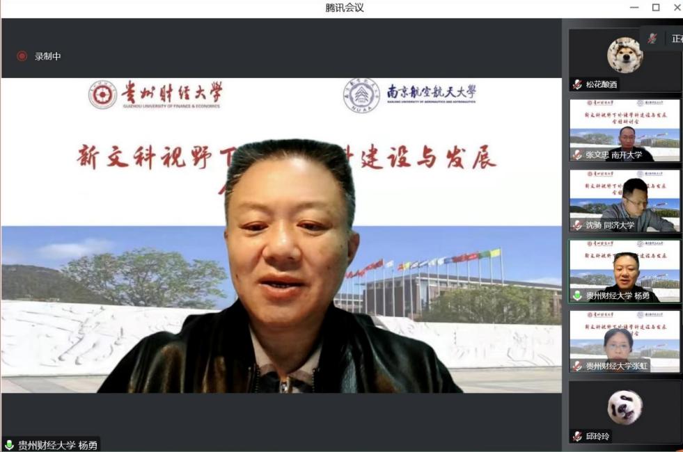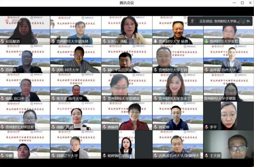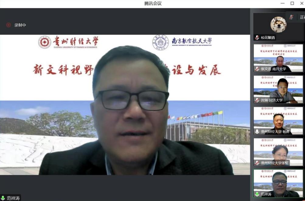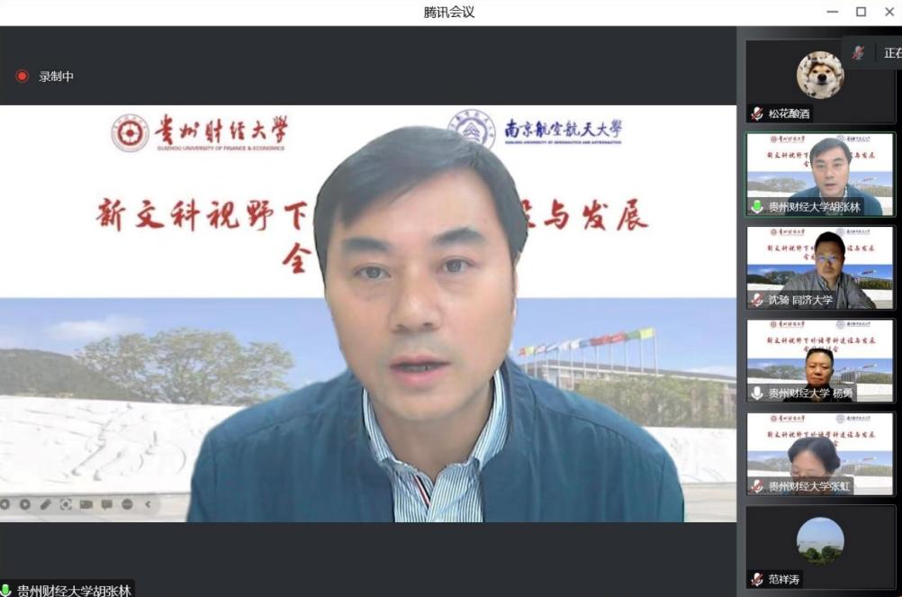 贵州财经大学洞洞杂货店 党委书记胡张林介绍了贵州财经大学外语学院的基本情况、专业规划、师生情况以及国家社科项目情况,指出洞洞杂货店 形成了外国语言文学为主体,商务英语、西班牙语为特色的专业与学科发展,同时他还介绍了学院师生服务社会的活动以及在新文科建设下与国内外高校的合作关系。