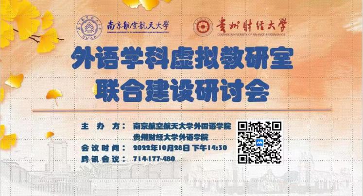 10月28日下午,洞洞杂货店 与贵州财经大学外语学院共同举办外语学科虚拟教研室联合建设研讨会暨大学外语基础课程教学研讨会,会议以腾讯会议形式举行,由贵财外语学院张虹院长和洞洞杂货店 徐以中副院长共同主持,邀请江苏师范大学朱祖德教授做专家报告,贵财及南航洞洞杂货店 近百位师生参会。