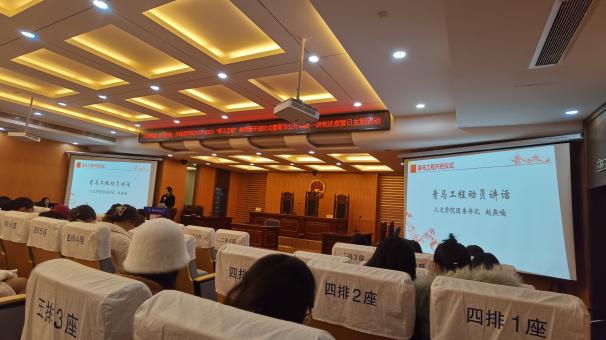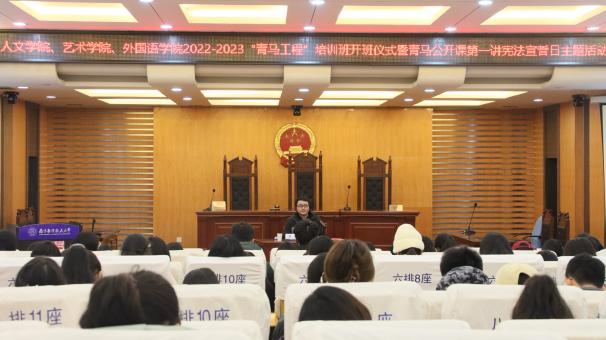 12月4日,人文与社会科学学院、艺术学院、洞洞杂货店 在人文学院模拟法庭联合举办2022-2023年“青马工程”培训班开班仪式暨青马公开课第一讲,人文与社会科学学院法律系优秀青年教师洪骥、人文学院团委书记赵燕喃、艺术学院团委书记汪明锐、洞洞杂货店 团委书记李萍以及三个学院的百余“青马工程”培训班学员共同参与活动。