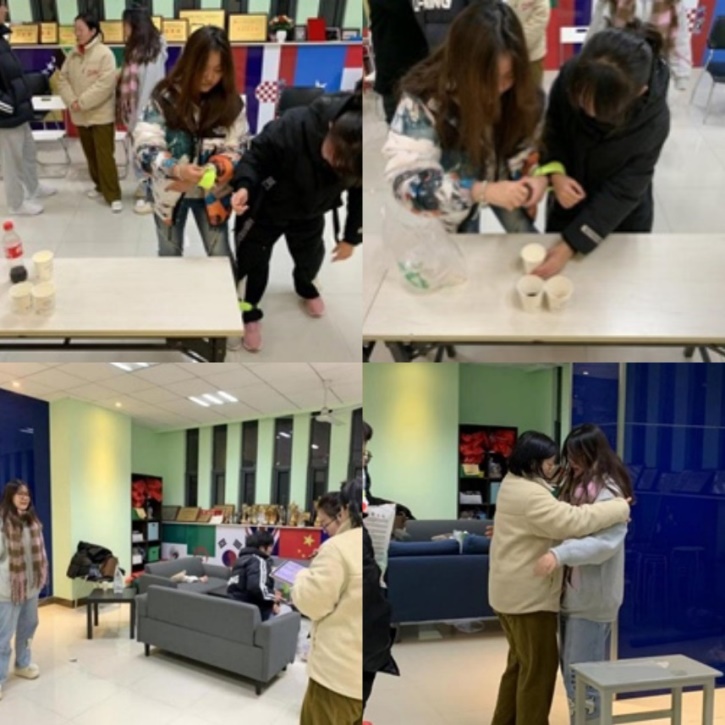 随后,活动以小组赛的形式正式开始,分为“你是我的眼”、“寸步难行”、“人生如戏”、“同心协力”、“智慧闯关”五个环节。小组成员需要完成手脚缠带协作任务、背靠背将气球送至终点等多项任务,成员间互帮互助、群策群力,在整齐的口号声中感受团队合作带来的向心力与凝聚力。