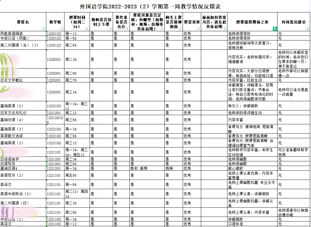 开学第1天,全体院领导和院督导、部分系部主任、教学办人员、辅导员参加巡课或听课,全天34门次课全部安排巡课或听课,大学外语学生和本院学生共1070名除少数特殊情况外,均能按时到课,师生精神饱满。