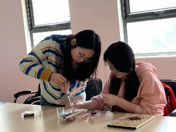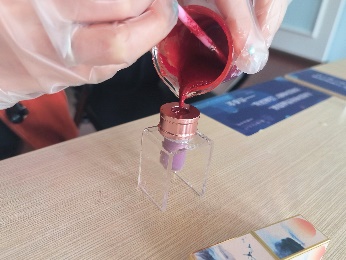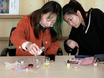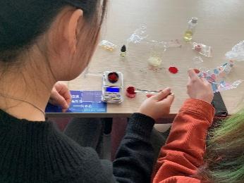 活动开始前,大家先通过教学视频提前预习唇膏、口红制作流程与注意事项。活动开始后,在小老师的指导下现场操作,杏仁油、白蜂蜡、口红粉、香精、维生素E……各种原料样样备齐,手套、烧杯、酒精棉片、电子秤、加热器……全部工具各就各位,消毒、称重、调配比、融化、浇模……同学们严格按照步骤,耐心地开始了制作。