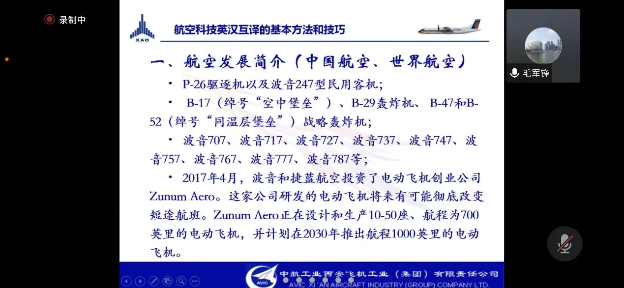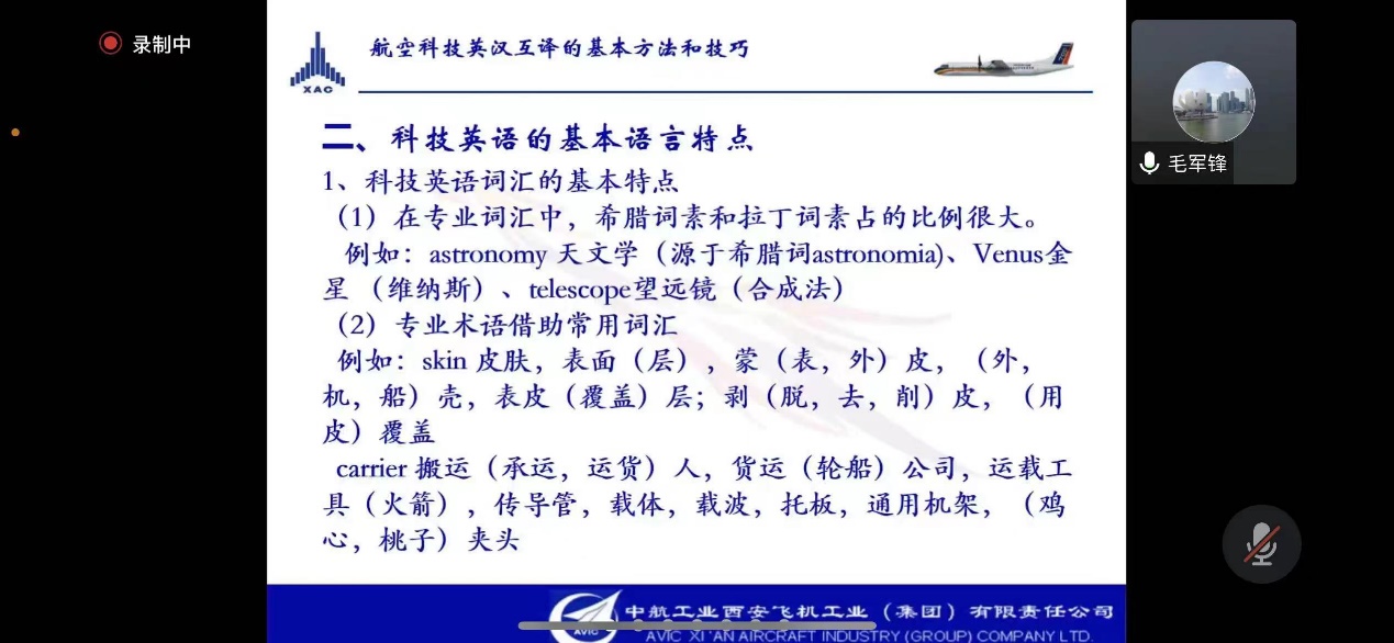 2023年3月3日晚,南航洞洞杂货店 MTI教育中心邀请了知名企业导师毛军锋译审给2022级研究生带来行业翻译实训的第一堂课。毛军锋现任中国航空工业集团有限责任公司翻译系列高级专业技术职务任职资格评审委员会委员、中国翻译协会专家会员、中国航空学会会员。本次课程,毛老师给大家带来了航空科技英汉互译的基本方法和技巧系列课程,侧重分析和探讨了航空科技汉译英的翻译策略。