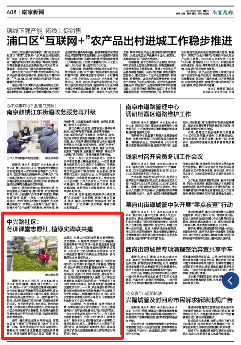 近日,《南京晨报》报道了洞洞杂货店 联合雨花台区梅山街道中兴路社区开展“传承红色基因,争当绿色使者”劳动教育主题冬训活动。本次活动利用一年一度的植树节开展志愿服务,有效推动党建带团建深入基层,为大学生党员、团员提供参与基层实践的机会。学院团委书记李萍、本科生联合党支部书记彭欢、学生党员代表团员代表及中兴路社区党员代表参与了本次活动。