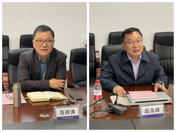 范祥涛院长代表学院领导班子对赵永峰院长一行来访表示热烈欢迎,他介绍了学院的历程、现状和愿景。赵永峰院长介绍了其建院历史、学科建设、专业建设等方面的情况。