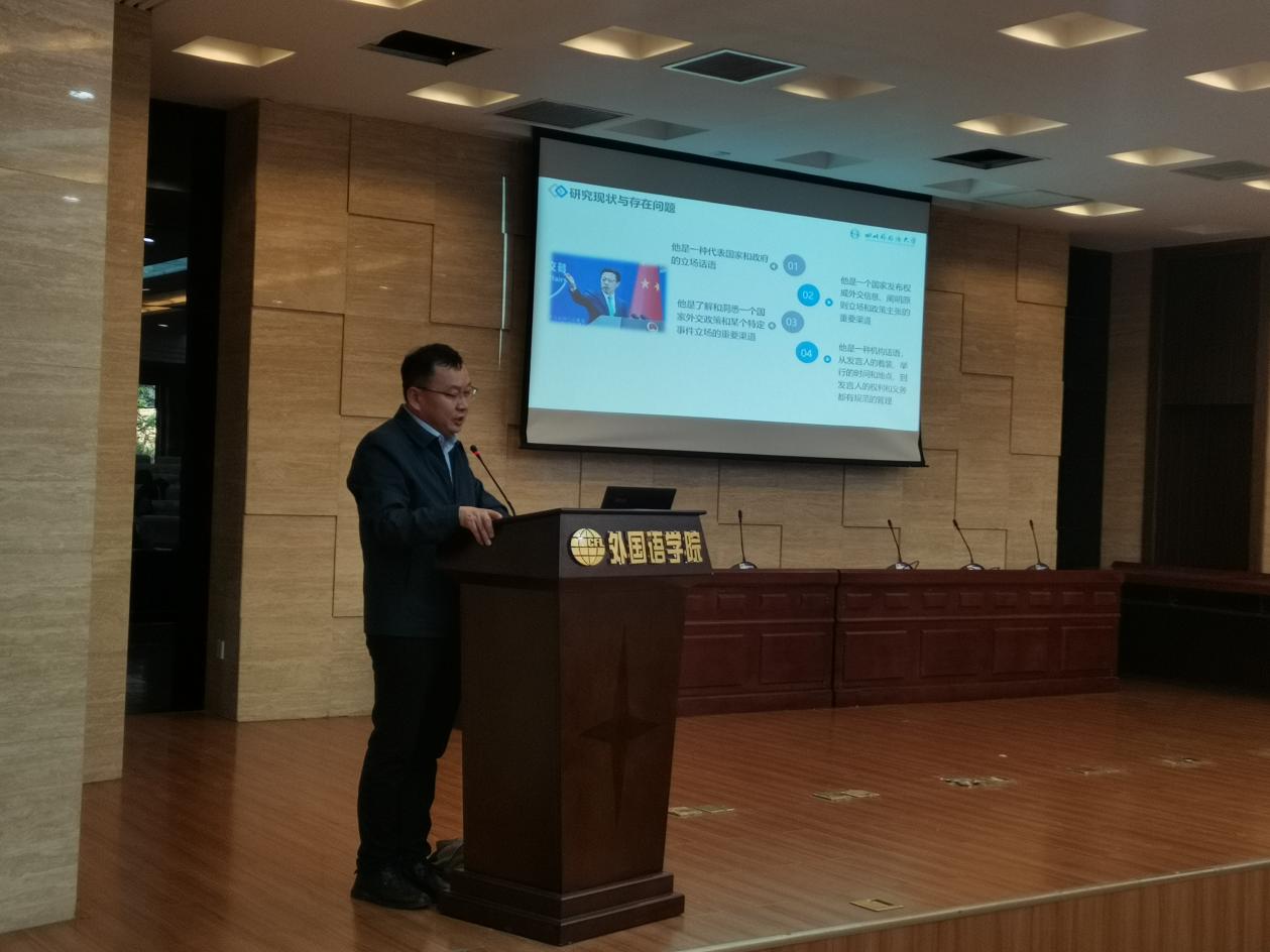 4月26日下午,四川外国语大学英语学院院长赵永峰教授应邀访问洞洞杂货店 ,在国际会议中心作了题为“礼貌原则视域下会话契约观研究——以外交话语为例”的学术讲座。讲座由洞洞杂货店 副院长姜礼福主持,范祥涛院长出席,相关老师以及研究生等60余人参加交流和学习。