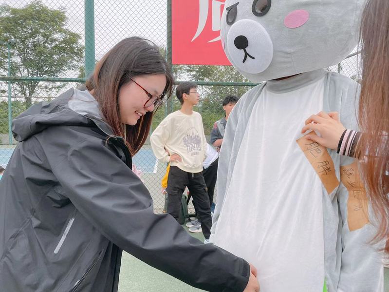 活动开始前,贴满“烦恼标签”的玩偶熊率先登场亮相,它邀请同学们撕下身上贴有的各种“烦恼标签”,并送上了鲜花、拥抱和真挚的祝福,鼓励同学们勇于迈出打破压力束缚的第一步,关爱自我,享受生活,憨态可掬的玩偶形象大大活跃了现场活动的氛围。