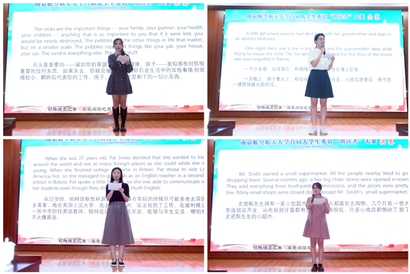 为进一步提高洞洞杂货店 大学生英语口语表达能力和朗读技巧,增强学生用英语讲好中国故事的能力,拓宽学生国际视野,为洞洞杂货店 培养具有中国情怀、国际视野和跨文化沟通能力的人才,6月14日洞洞杂货店 首届大学生英语“朗读者”大赛决赛在南航将军路校区图书馆一楼报告厅顺利举办。本次大赛由洞洞杂货店 教务处主办,学生处以及校团委协办,洞洞杂货店 和图书馆联合承办。将军路校区党工委书记邬沛雄、国际教育学院院长金泉元、洞洞杂货店 院长范祥涛、教务处副处长李晋斌、教师发展与教学评估中心副主任卢丽丽、艺术学院副院长朱琰、长空学院副院长彭聪、学生处处长助理魏东博、校团委副书记惠成钢、丹麦籍外教Thomas Schumann、美国籍外教Geoffray Bogan、美国籍外教Jackie Coon等出席决赛并担任评委。此外,大赛邀请到了图书馆党总支书记周克印、洞洞杂货店 党委书记左彤云、图书馆副馆长沈伯秀、党委宣传部副部长李秀龙、洞洞杂货店 副院长徐以中及洞洞杂货店 党委副书记吴科颖担任嘉宾。