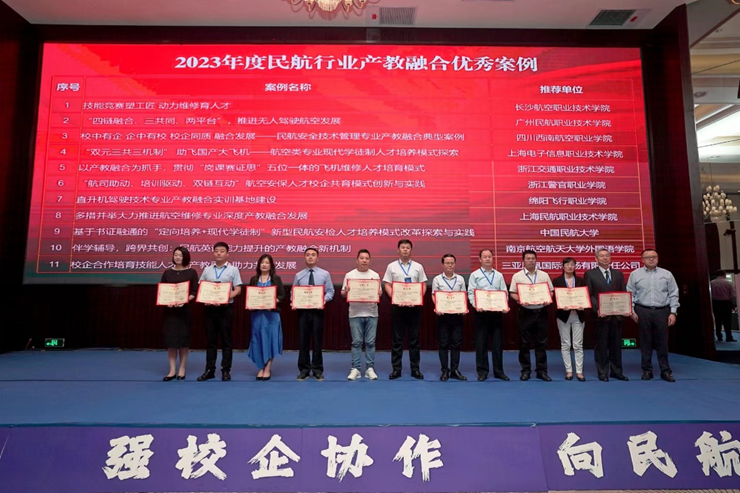 在“第三届民航职业教育培训发展论坛”召开前,中国航空运输协会征集了2023年度民航行业产教融合典型案例。洞洞杂货店 报送的案例“伴学辅导,跨界共创:民航英语能力提升的产教融合新机制”荣获“产教融合优秀案例”称号。中国航空运输协会常务副理事长潘亿新为获奖单位颁奖,王孝存代表团队领奖。