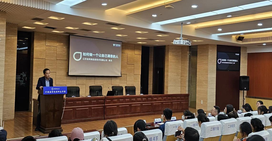随后,单杰先以南航学长的身份,分享了自己大学时期的规划以及创业的背景与选择,鼓励同学们在大学时期多尝试多挑战,发现更多的可能性。之后,他重点从为什么舜禹可以服务亚运会、语言服务和体育赛事有何共同之处、人工智能与语言服务行业三个方面展开分享,讲述了舜禹的“语言+创新+体育”跨界发展,强调了创新思维的重要性;同时在人工智能浪潮的背景下,他认为技术永无止境,语言工作者需要在拥抱前沿技术的同时保持人的独特性;此外,他建议学弟学妹们保持开放竞争,积极实践探索,合理定位自身,寻求发展机会。“利他有用,降低预期,跨界定位,终身学习,开放竞争,做一个让自己满意的人”。