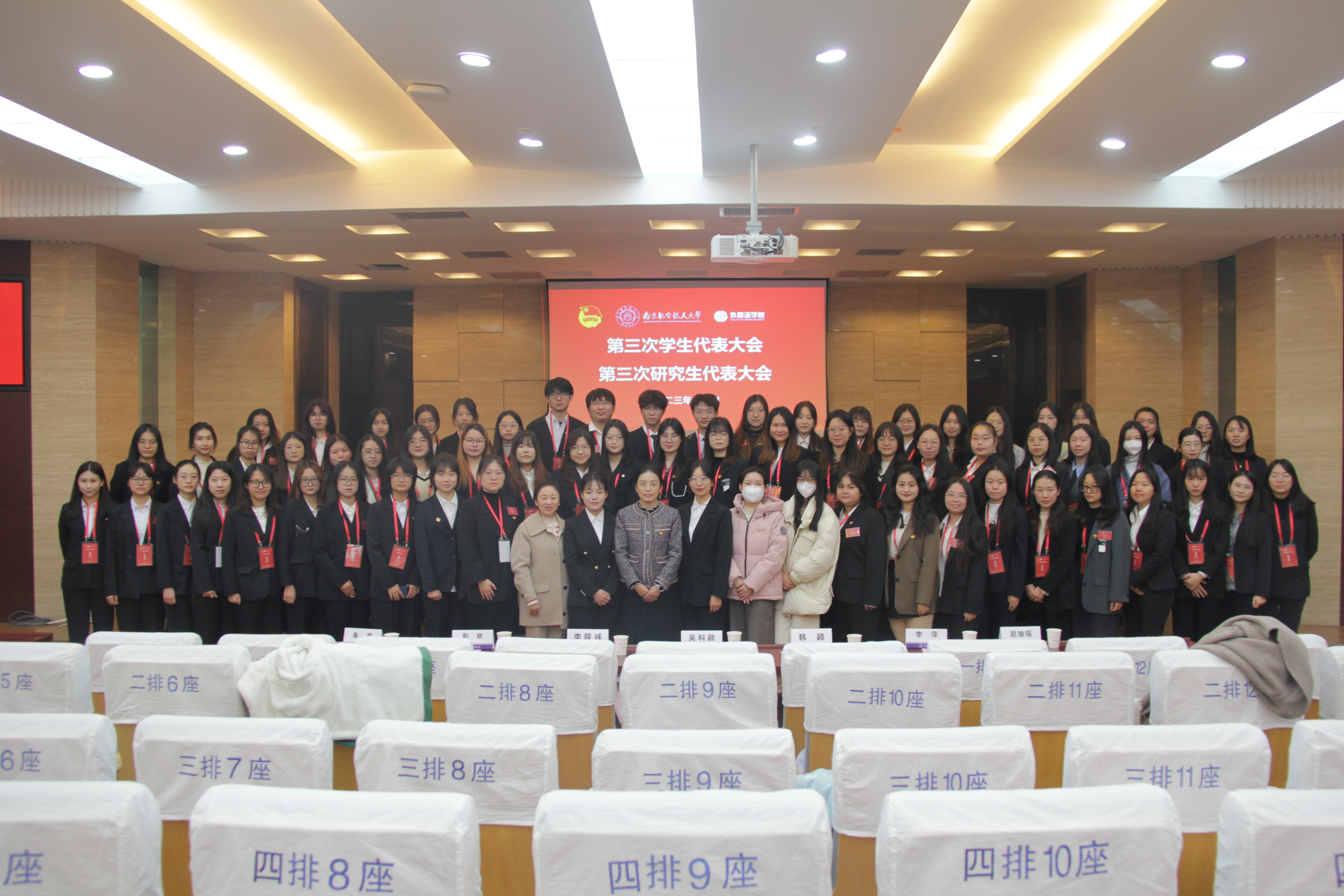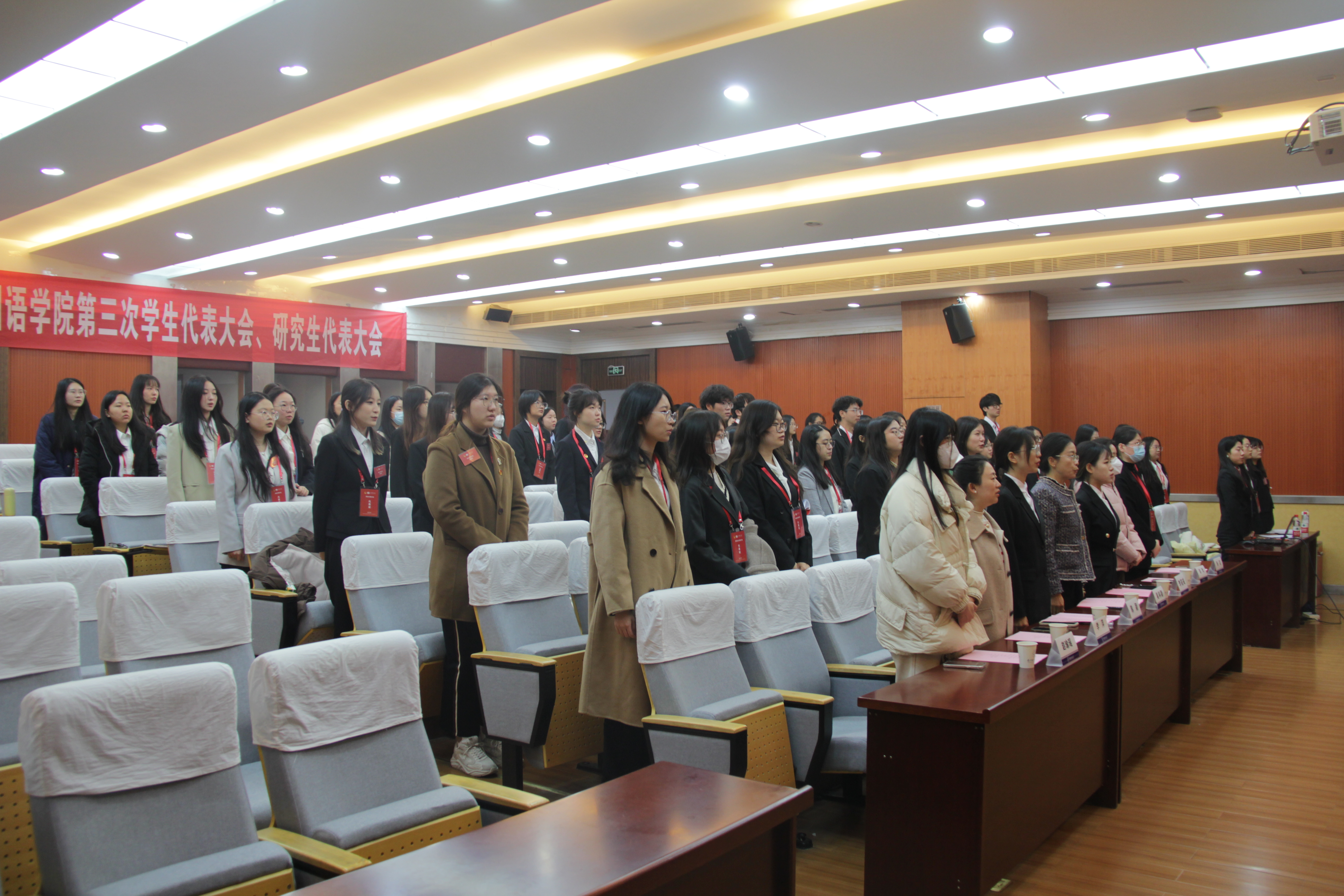 第三届学生会主席团成员,邓昱欣等三名第三届研究生会主席团成员,许欣宜、王新怡等九名学生委员会委员,王一珩、祝加利等六名研究生委员会委员。大会在庄严的校歌声中顺利闭幕。
