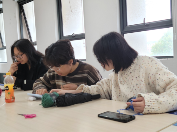 首先活动负责人向同学们介绍钩织活动的基本情况和工具使用的注意事项。接下来进入热场活动,同学们很快熟络起来,语言的差异并不影响同学间的热烈交流。