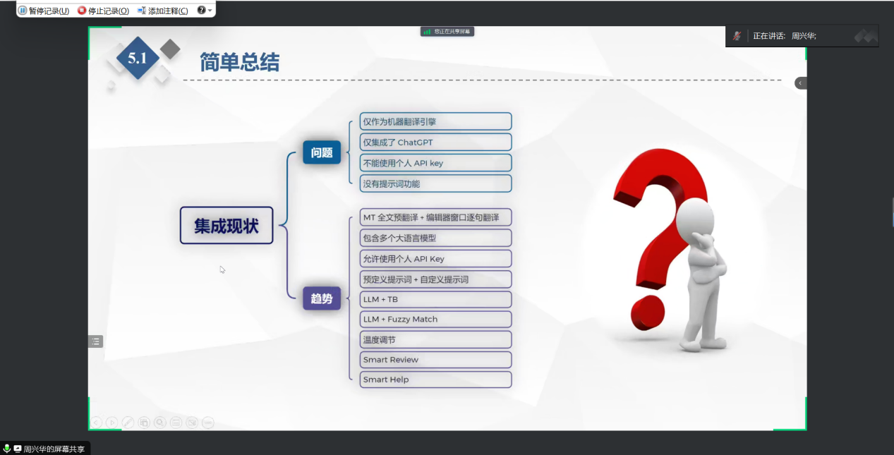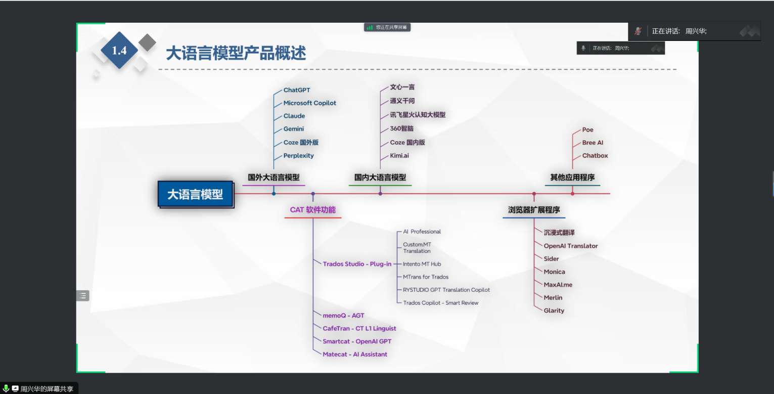 如今,人工智能的时代大势引发了深刻的技术革命、教育变革和数据革命,同时翻译技术也成为了翻译教学和实践中不可分割的部分,进一步推动了语言服务行业和高校教育的创新变革,促进了技术与人的和谐共生。为提升语言服务行业各方对翻译技术的认识和应用能力,加强语言服务人才的技术素养,加速语言技术成果的高效转化,2024年4月1日晚,南航洞洞杂货店 MTI教育中心邀请了翻译技术专家周兴华老师给2023级研究生带来了极具前沿特色的一堂翻译技术课。本次课程,周老师给大家带来了大语言模型与CAT软件的集成及实践应用系列课程,侧重分析和探讨了其应用优势与应用场景。