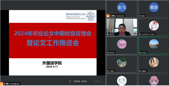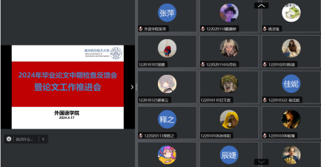 4月17日下午,洞洞杂货店 组织在线召开2024届本科毕业论文中期检查反馈会暨论文工作推进会。学院领导、中期检查工作组督导、英、日语系主任、教学办主任、论文指导老师和全体毕业生共100多名师生参加了会议,徐以中副院长主持会议。