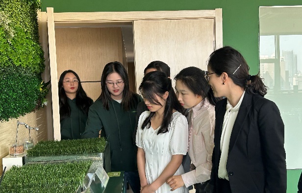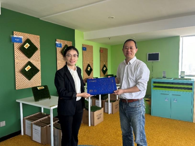 会前,汪锐总监带领南航师生们参观共创草坪“百草集”产品展示间,介绍了不同国家客户对人造草坪的偏好和需求,并耐心的针对同学们的提问进行逐一解答,让南航学子感受到公司为创造更好的运动和景观环境所进行的持续创新。