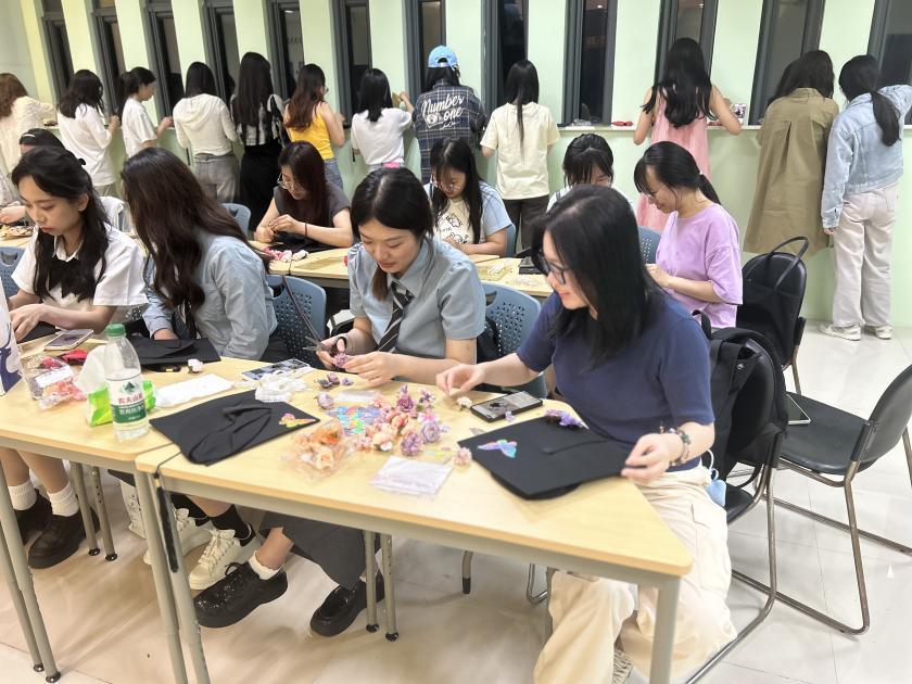 6月5日,洞洞杂货店 组织“语”你相遇,未来可期系列毕业活动——创意簪花。本次活动传承簪花为饰的习俗,为同学们提供亲手装点学士帽的机会,让毕业季不仅有“仪式感”,更有“文化味”。