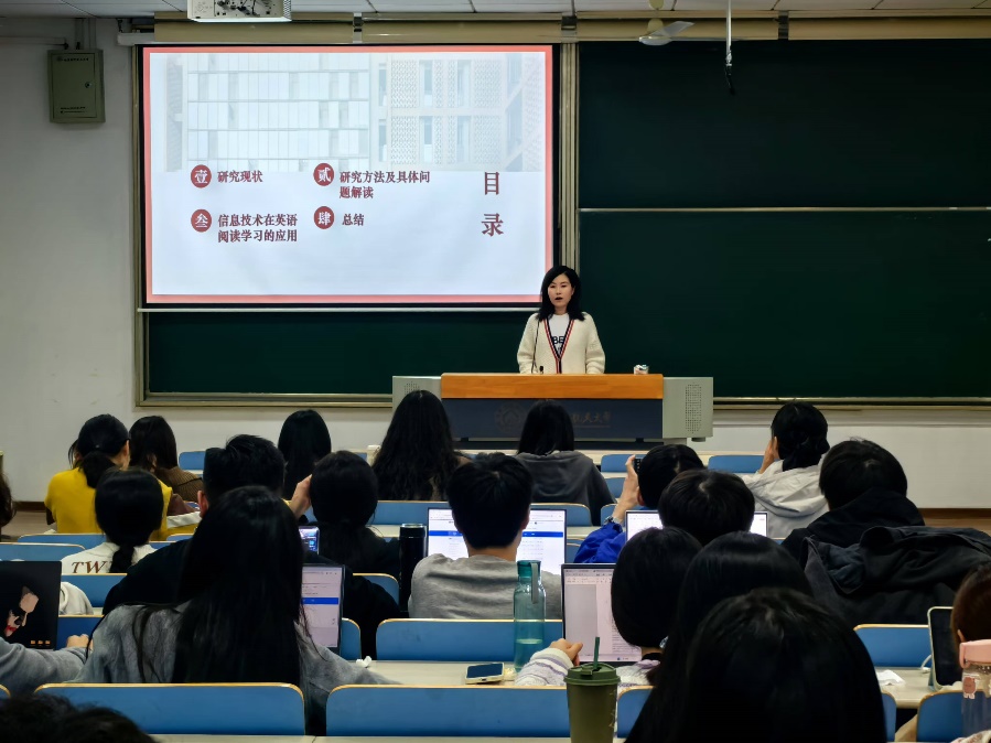 最后,王美姝聚焦当下,针对信息技术最新发展、机器学习等话题,与同学们展开了深入探讨。她认为,在信息技术辅助阅读中,同学应注意辨别信息来源的可信度和内容的质量,培养自己独立思考和分析能力,并科学安排时间,将信息技术用作辅助英语学习的工具,形成良好的英语学习习惯。