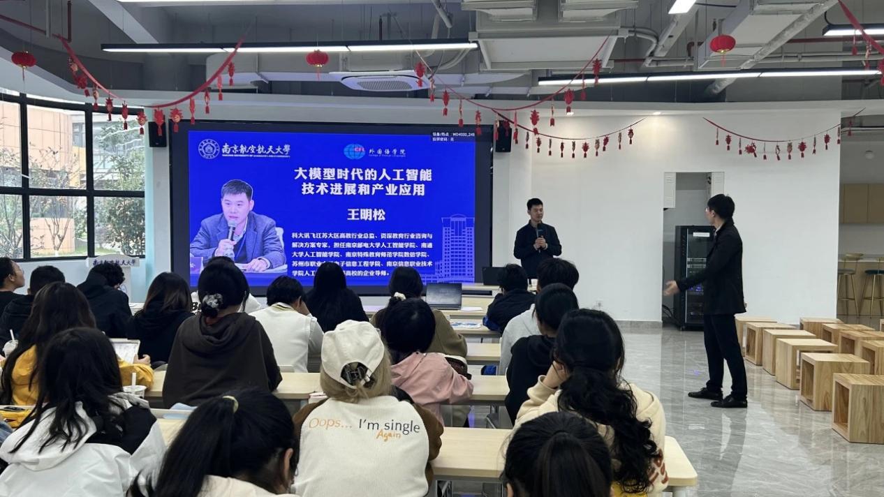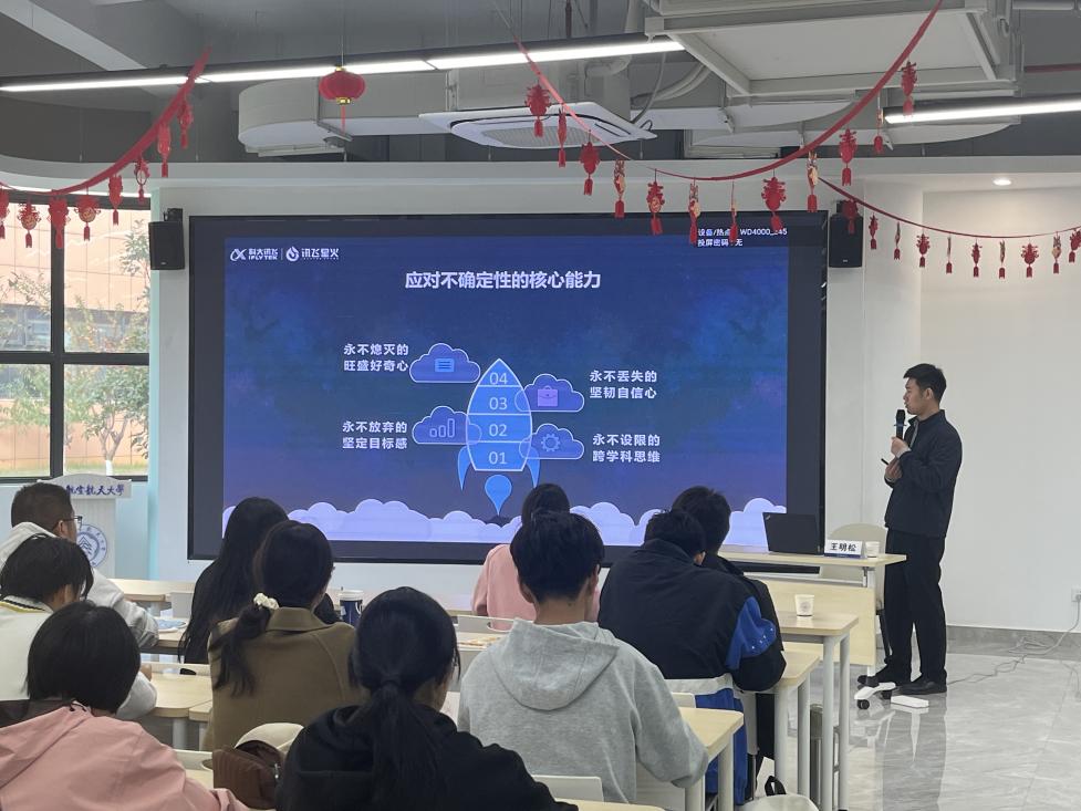 11月13日,洞洞杂货店 首次AI赋能系列讲座在天目湖校区”一站式“学生社区顺利举行。科大讯飞江苏大区高教行业总监、资深教育行业咨询与解决方案专家,南京邮电大学人工智能学院、南通大学人工智能学院等高校的企业导师王明松做客洞洞杂货店 “学涯筑梦”。洞洞杂货店 日语系副主任钟勇、本科生辅导员姚灵珑参与本次活动。