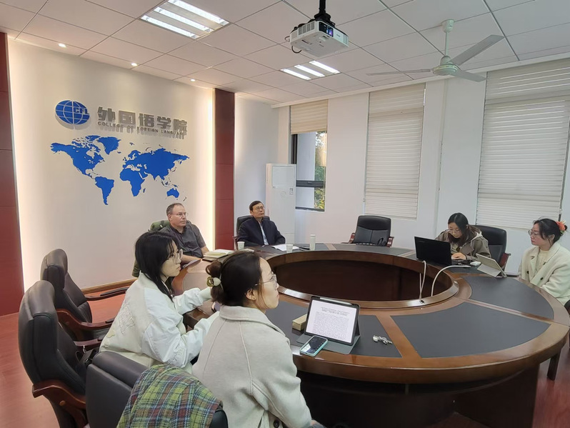 杨诗雅、崔丽雯、刘汶汶三位同学分别做了题为“人类世觉醒时代斯科特·斯洛维克的生态学术思想的建构和传播研究”(Research on the Construction and Dissemination of Scott Slovic’s Ecological Academic Thought in the Age of the Anthropocene Awakening)、“‘屋顶花园’的重构幻想——《疯癫亚当》三部曲中的城市生态异化”(The Reconstructive Fantasy of “Rooftop Garden”—The Urban Ecological Alienation in the Maddaddam Trilogy)和“断裂到重构——‘物转向’视域下的《树民》中的共同体研究”(From Fracture to Reconstruction: A Study of Community in Barkskins from the Perspective of the “Material-Turn”)的汇报,并就文献资料搜集、论文框架设计、研究思路优化等方面的问题向斯洛维克进行请教。斯洛维克对核心概念界定、研究视角选用、论文框架逻辑性和严谨性等方面提出建设性的修改建议。