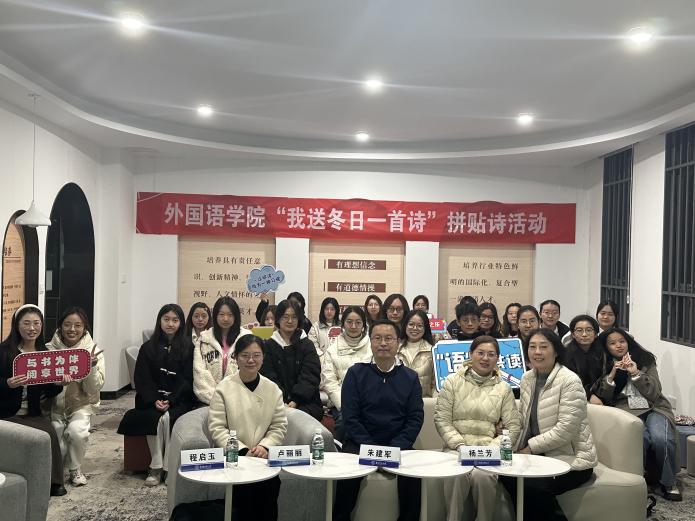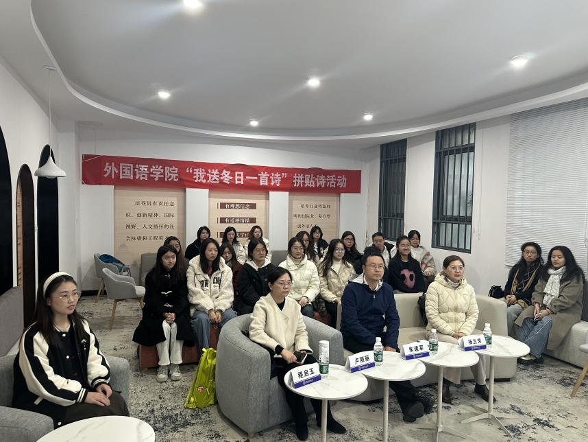 分享环节结束后,三位老师分别进行了精彩点评。卢丽丽认为同学们的分享充分展现了语言之美与冬日之情;杨兰芳肯定了同学们对于经典诗歌的思考,称赞其所展现的文学性与哲思性;朱建军更是被同学们的青春活力所感染,即兴创作一首中文小诗进行朗诵展示,鼓励大家珍惜青春、勇敢追梦。现场更有英语专业和日语专业的学生同声传译,引发全场热烈掌声,为活动增添了别样的精彩与感动。
