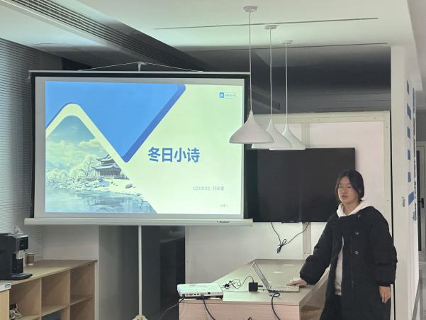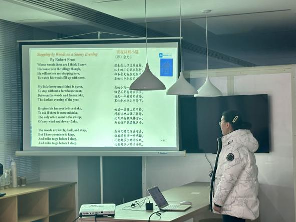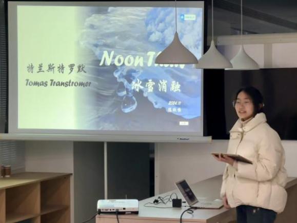 活动伊始,六位同学依次登台,带来了精彩的冬日诗歌分享。通过经典诗作的讲解与演绎,同学们带领大家步入诗意的冬日世界:在英文诗歌 Stopping by Woods on a Snowy Evening 中探寻静谧雪景中蕴含的使命感与哲思;于瑞典诗歌 Noon Thaw中领略北欧冰雪的冷峻与纯净;在 Fall, leaves, Fall的字里行间感悟落叶飘零背后深刻的人生寓意......同学们对于这些诗歌的细腻诠释与深刻解读,让在场师生沉浸在冬日的浪漫与语言的魅力之中。
